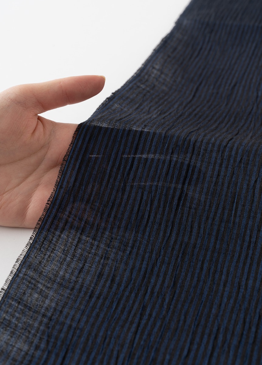 経糸を青と墨の細い縞で整経し、ヨコ糸で配色を変え織り上げています。見る角度や光の当たり方によって色の見え方が変わり、穏やかな色の移ろいが上品な印象を与えます。近江縮ならではの細かなシボが縞をよろけたように見せ、生地にさりげない表情を生み出しています。無地感覚でありながら味わいある、飽きのこない一枚です。