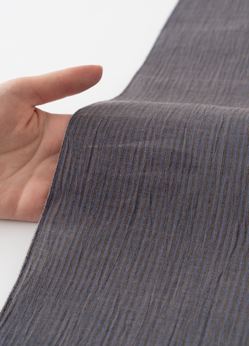 経糸を青と墨の細い縞で整経し、ヨコ糸で配色を変え織り上げています。見る角度や光の当たり方によって色の見え方が変わり、穏やかな色の移ろいが上品な印象を与えます。近江縮ならではの細かなシボが縞をよろけたように見せ、生地にさりげない表情を生み出しています。無地感覚でありながら味わいある、飽きのこない一枚です。