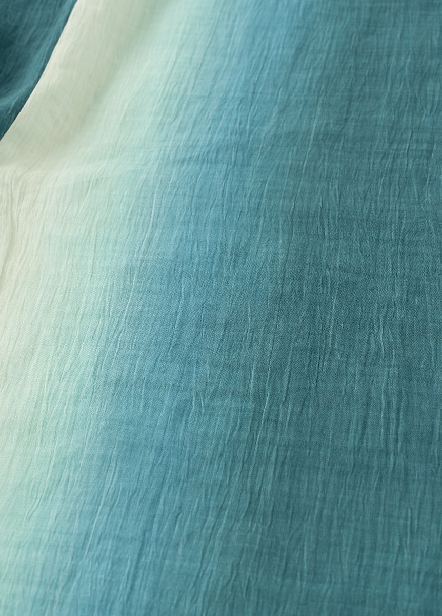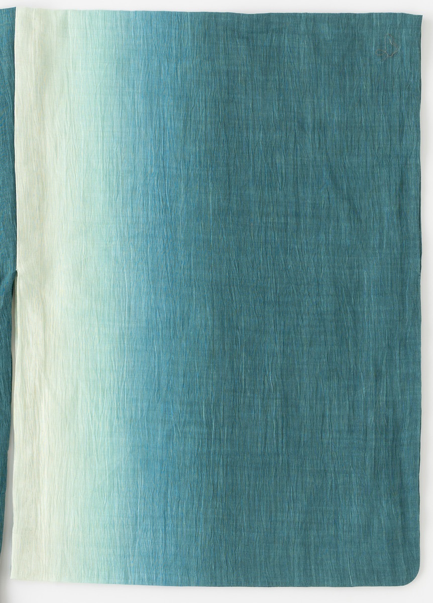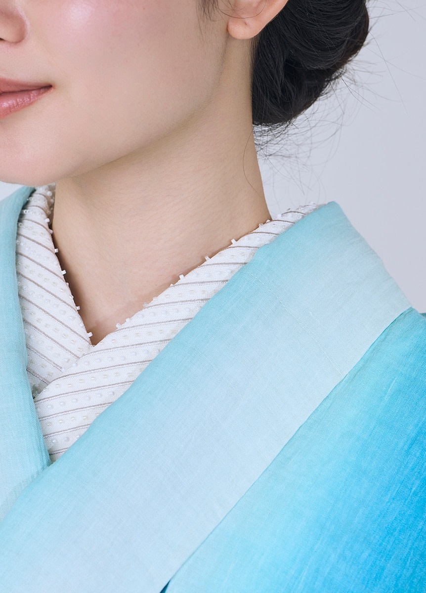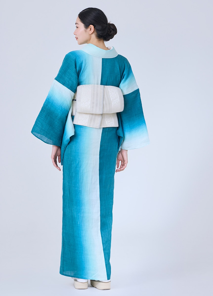 白で織りあげた近江縮に、いつか見た海の記憶を重ねるように、美しいグラデーションの染めを施しました。さらりとした近江縮の風合いに、さざめく波を思わせる色が重なり、涼やかな奥行きを生み出しています。たてのぼかしが、夏の着姿をすっきりと、清々しく見せます。