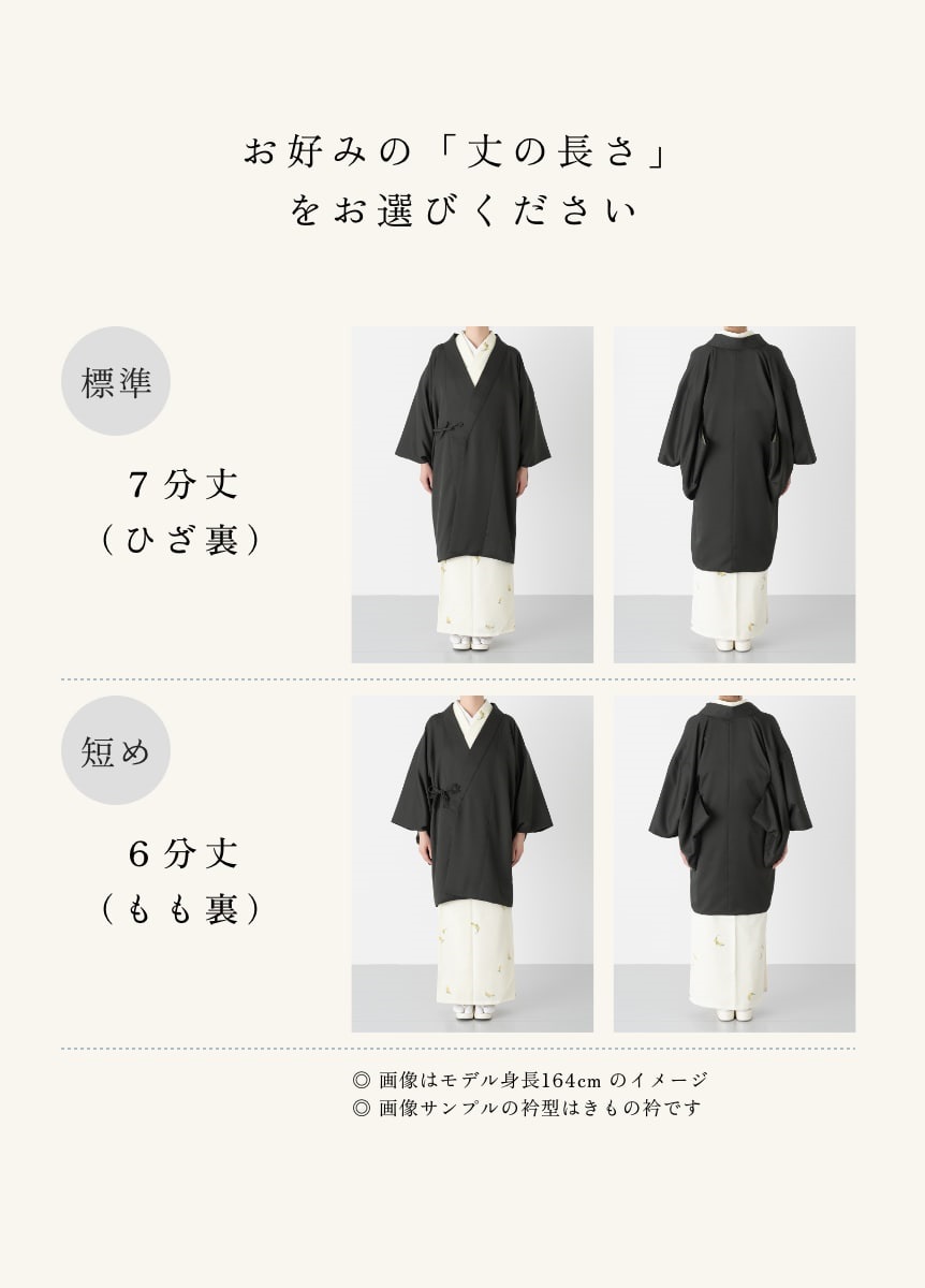 上下に分かれていて、長さの調整が可能な雨コートです。単衣仕立のため、年間を通してご着用いただけます。お天気が崩れそうな日に、道行衿コートとして上だけ着て、下を持ち歩くことで安心してお出かけいただけます。