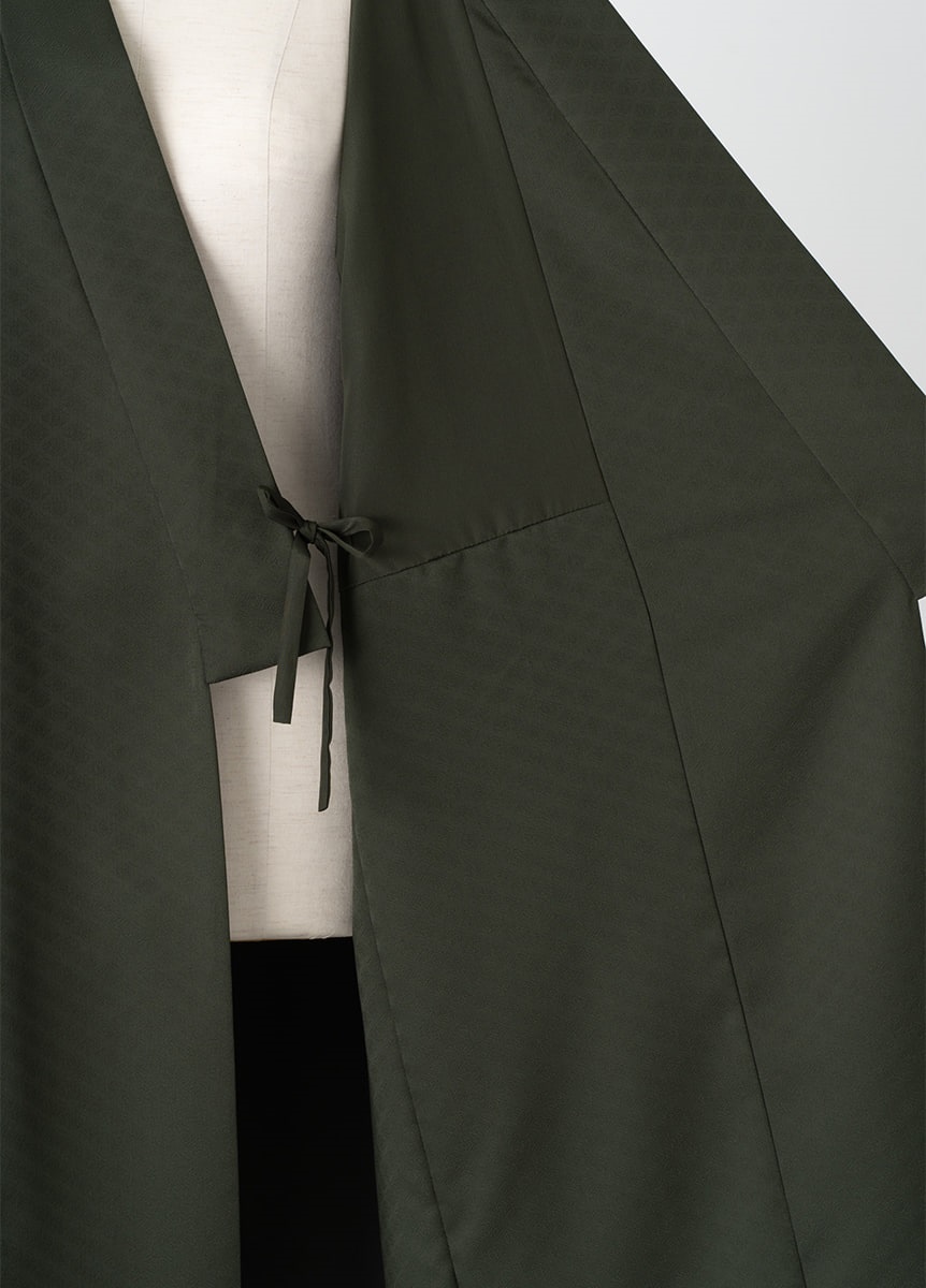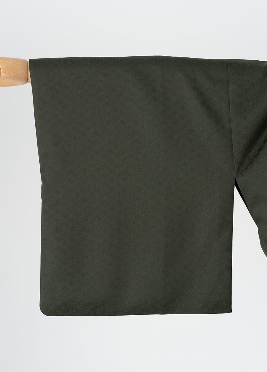 深みのある緑色は洒落感と上品さを両立した絶妙なカラー。 地紋には有職文様である七宝を織り上げました。シンプルな無地のためフォーマルな装いにも合わせやすいコートです。