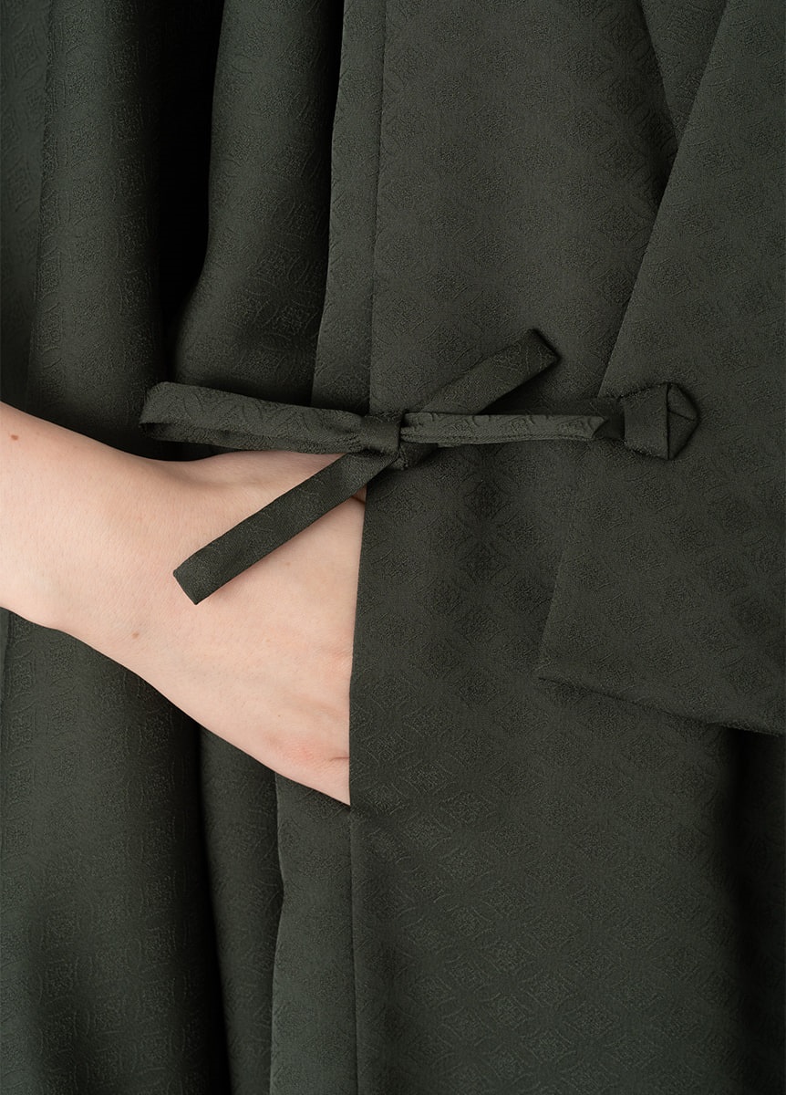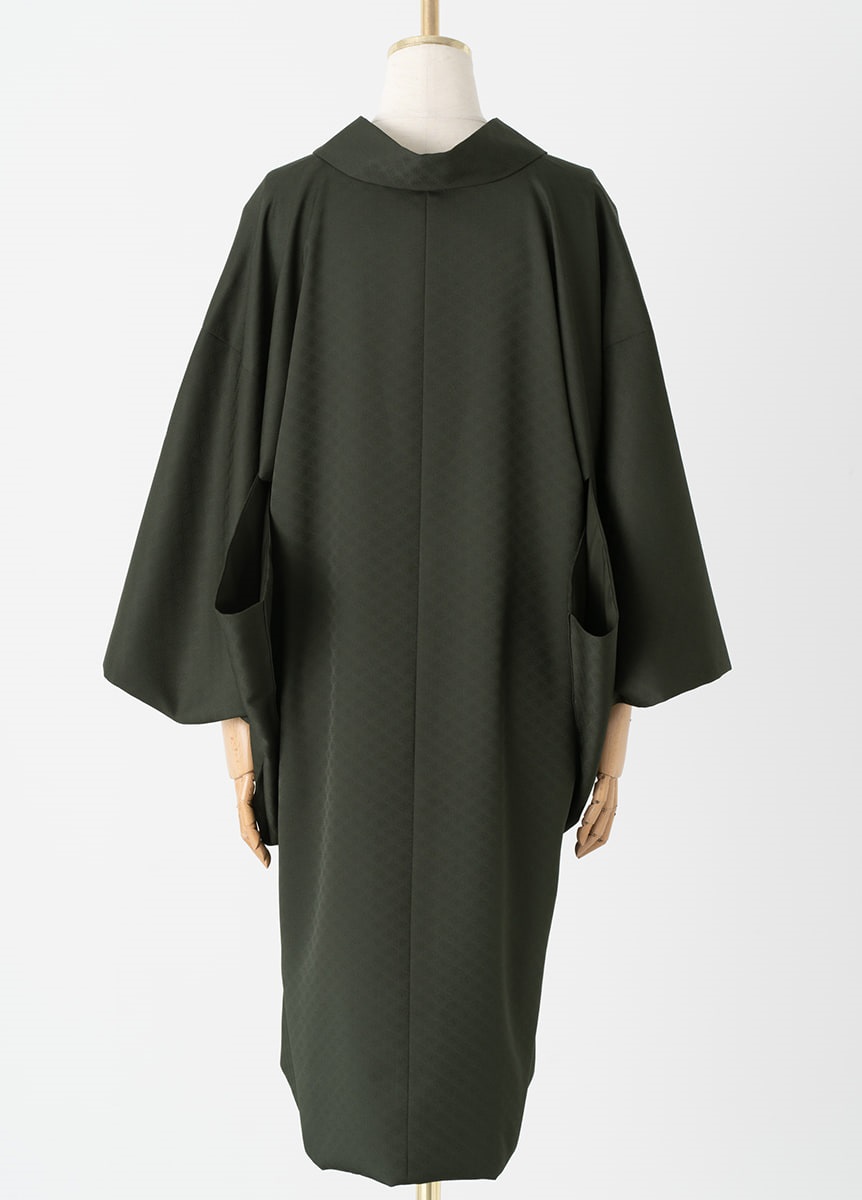 深みのある緑色は洒落感と上品さを両立した絶妙なカラー。 地紋には有職文様である七宝を織り上げました。シンプルな無地のためフォーマルな装いにも合わせやすいコートです。