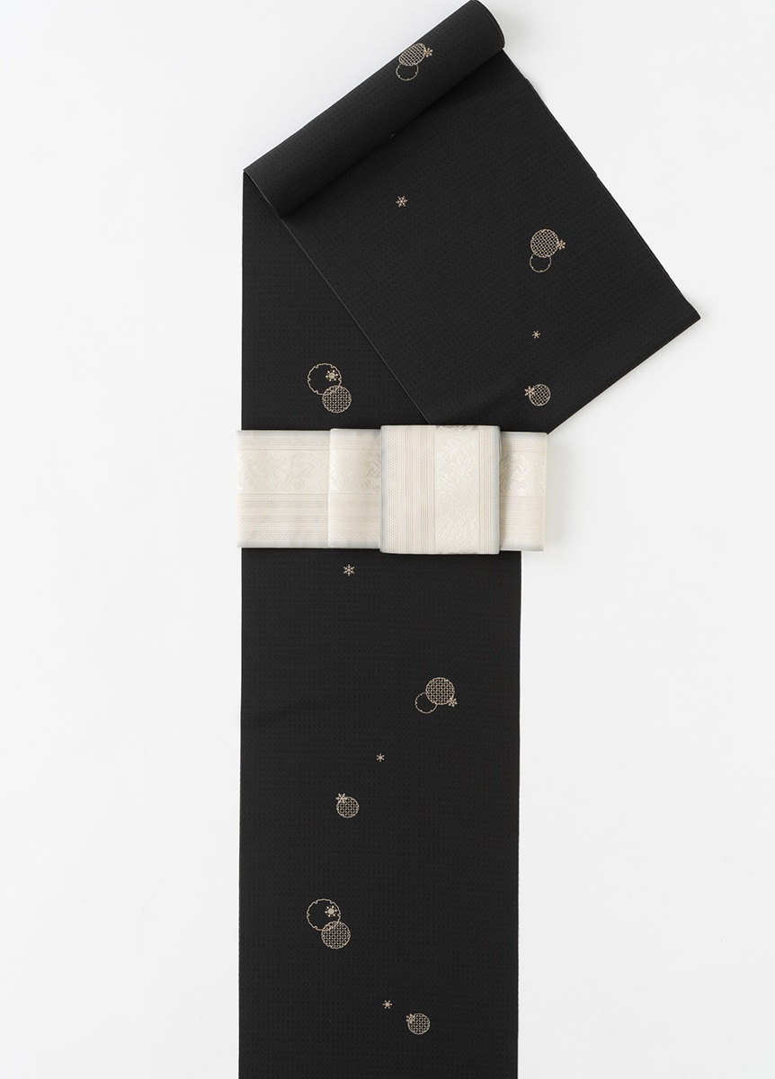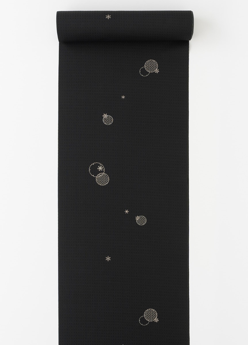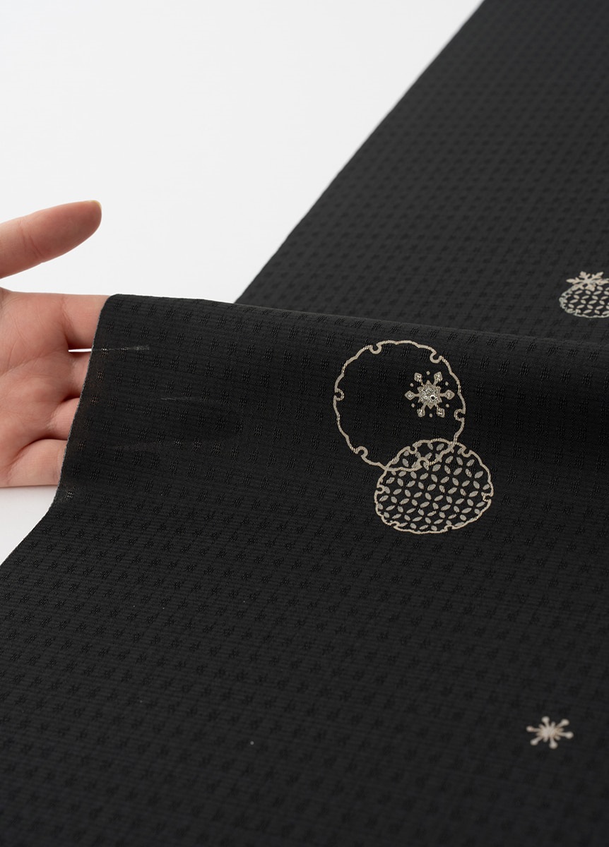 夏の暑さを和らげるような、ひんやりとする雪輪を描きました。雪輪の柄を面とシルエットで使い分け、小さな結晶を散りばめることで動きのあるデザインに。銀彩もさりげなく忍ばせることで、アクセサリーのような輝きを添えました。普遍的で帯合わせがしやすい墨黒色は、はじめての夏きものにもおすすめです。