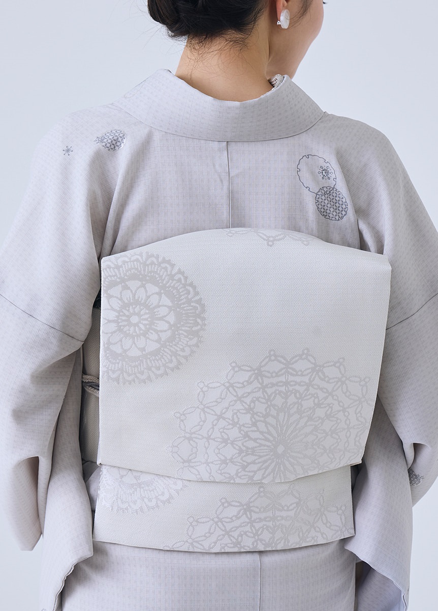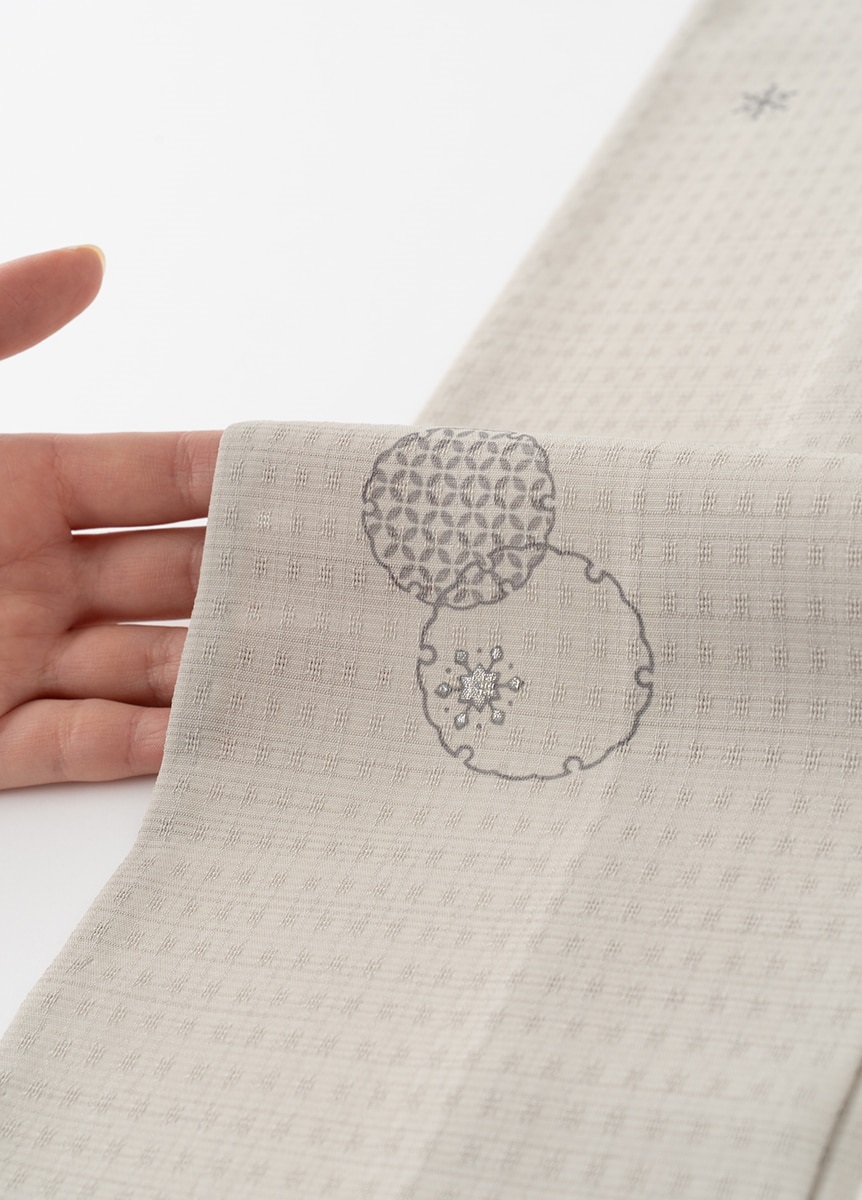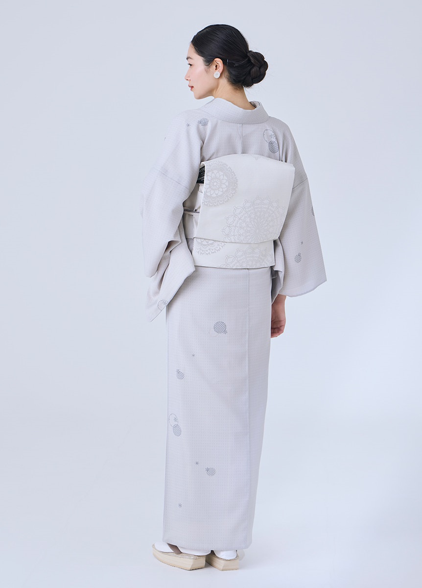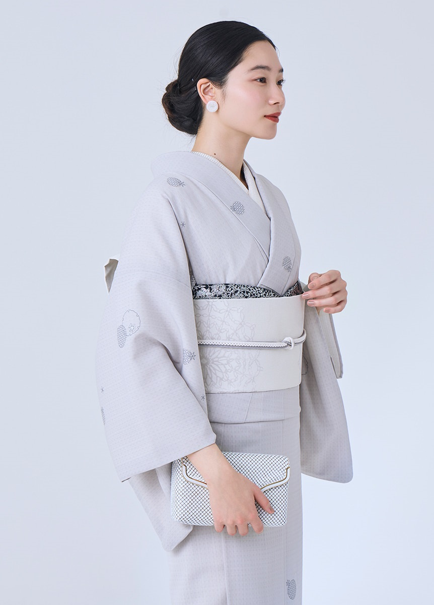 夏の暑さを和らげるような、ひんやりとする雪輪を描きました。雪輪の柄を面とシルエットで使い分け、小さな結晶を散りばめることで動きのあるデザインに。銀彩もさりげなく忍ばせることで、アクセサリーのような輝きを添えました。普遍的で帯合わせがしやすい白銀色は、はじめての夏きものにもおすすめです。