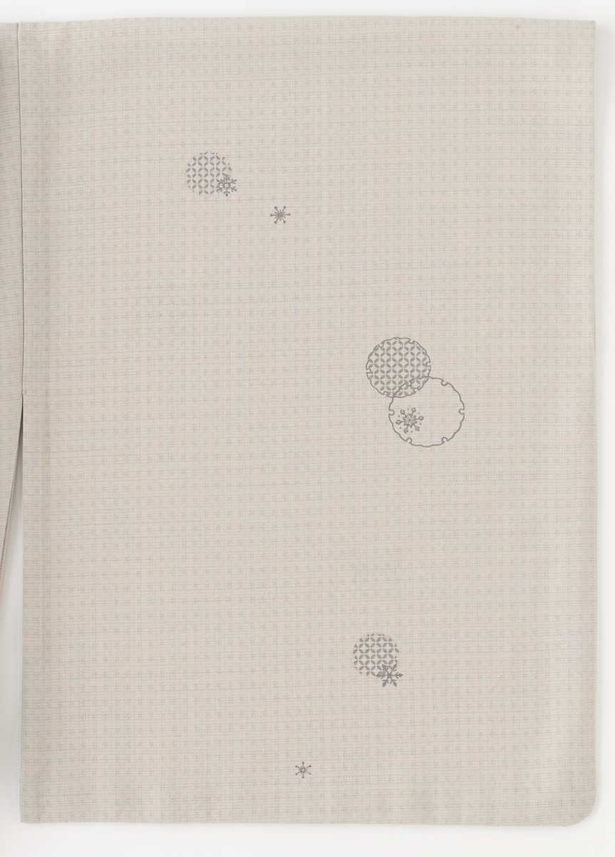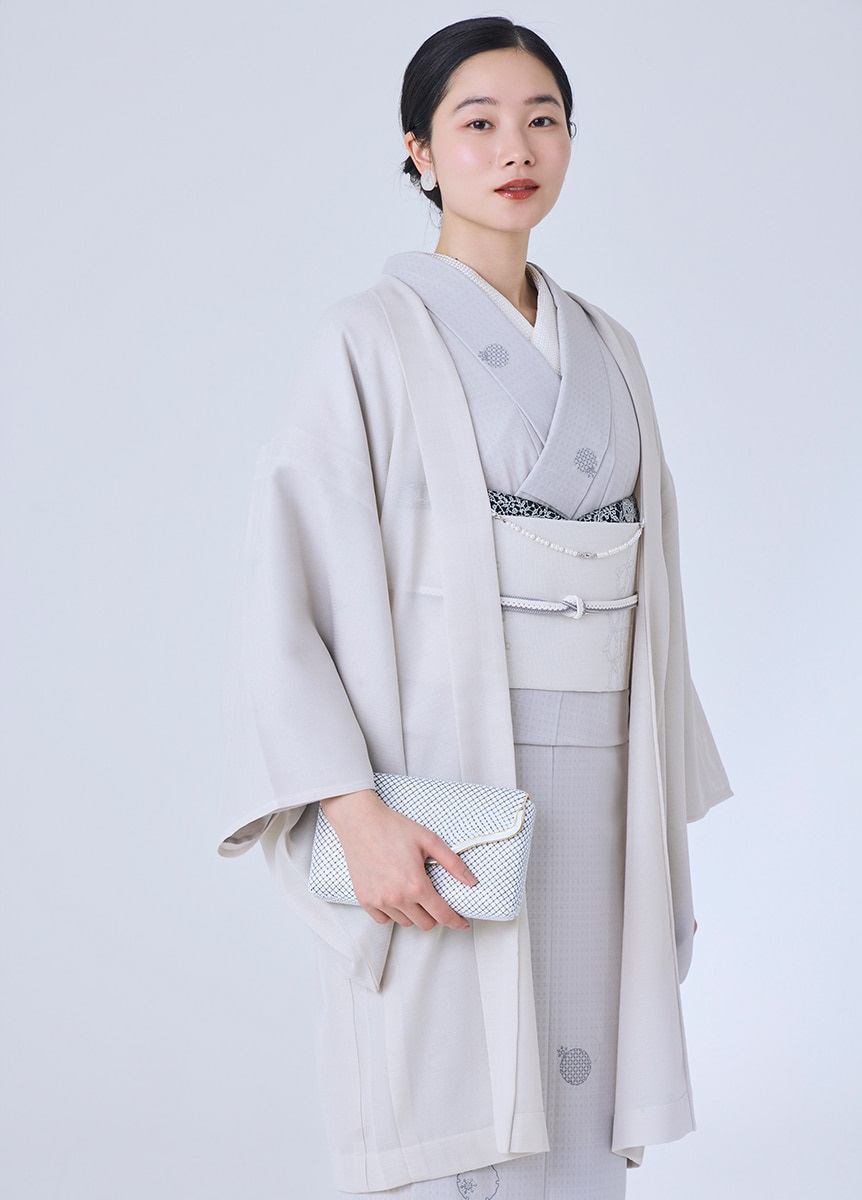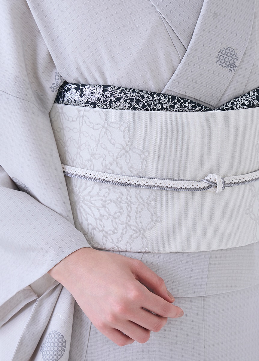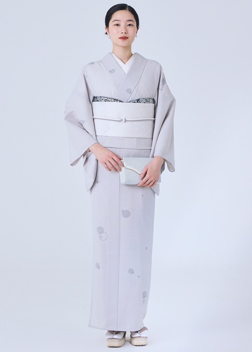 夏の暑さを和らげるような、ひんやりとする雪輪を描きました。雪輪の柄を面とシルエットで使い分け、小さな結晶を散りばめることで動きのあるデザインに。銀彩もさりげなく忍ばせることで、アクセサリーのような輝きを添えました。普遍的で帯合わせがしやすい白銀色は、はじめての夏きものにもおすすめです。
