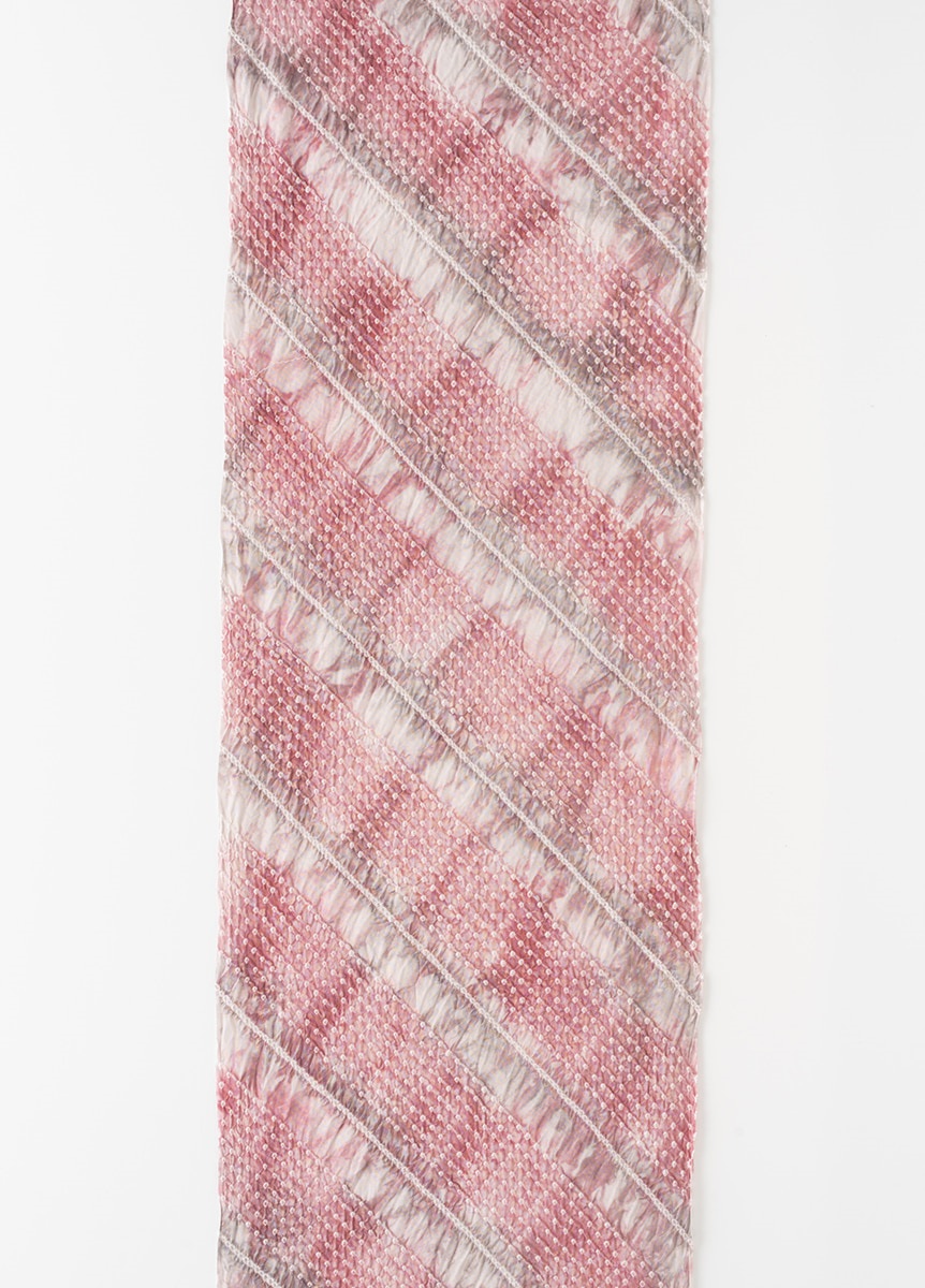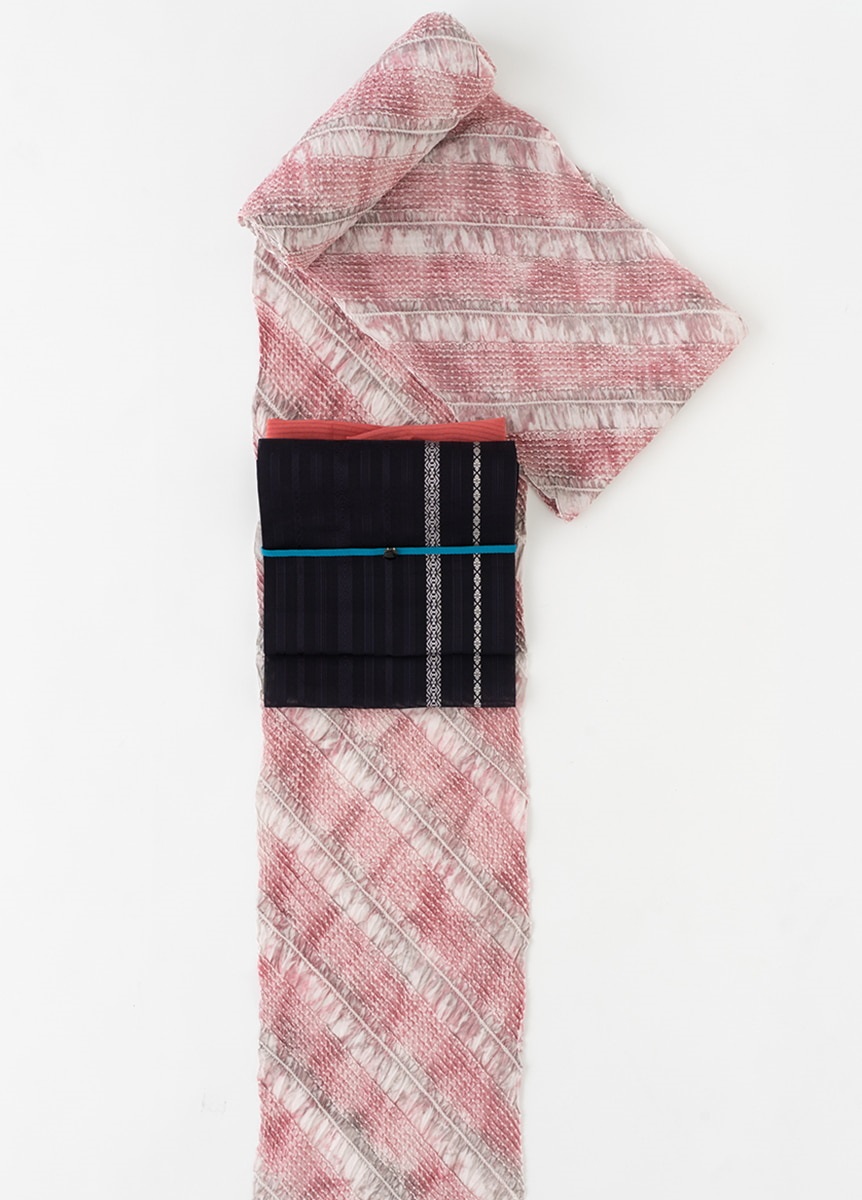 キャンディストライプという名前の通り、キャンディの包み紙をイメージした絞りゆかたです。甘くなりすぎない落ち着いたトーンの配色で、斜めのラインが着姿をすっきりと見せてくれます。ゆかたらしい楽しさと、絞りならではの上質感を併せ持つ一枚です。