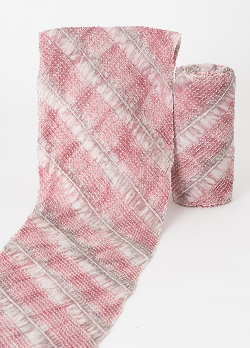 有松鳴海絞りは綿100%の生地に、様々な絞り技法を組み合わせて柄を表現しています。絞りを施すことにより、生地に凹凸が生まれます。そのため、肌との接地面が少なく清涼感へ繋がります。また、綿の柔らかな素材が肌当たり優しく肌心地の良い素材です。