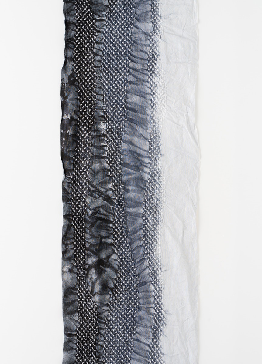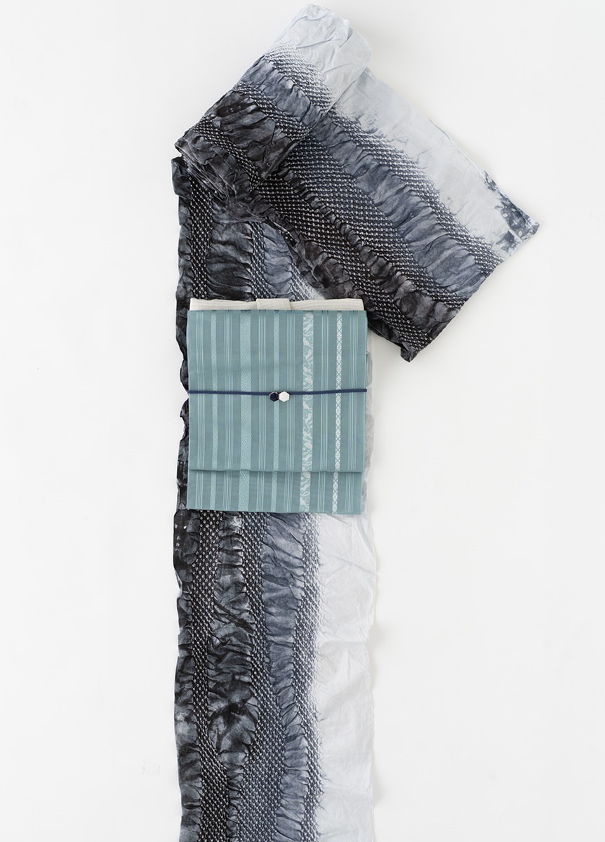 穏やかな波の揺らぎを、絞りでやわらかな曲線を描くことで表現しました。水の中で小さな空気の粒がやわらかく立ちのぼっていくようなデザインが、身体のラインに自然に沿い、着姿をすっきりと涼やかに見せてくれます。落ち着きのある色のグラデーションは、強い日差しの下でも、静かな夜でも、夏の空気にやさしく溶け込みます。