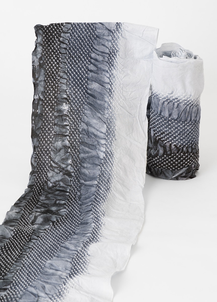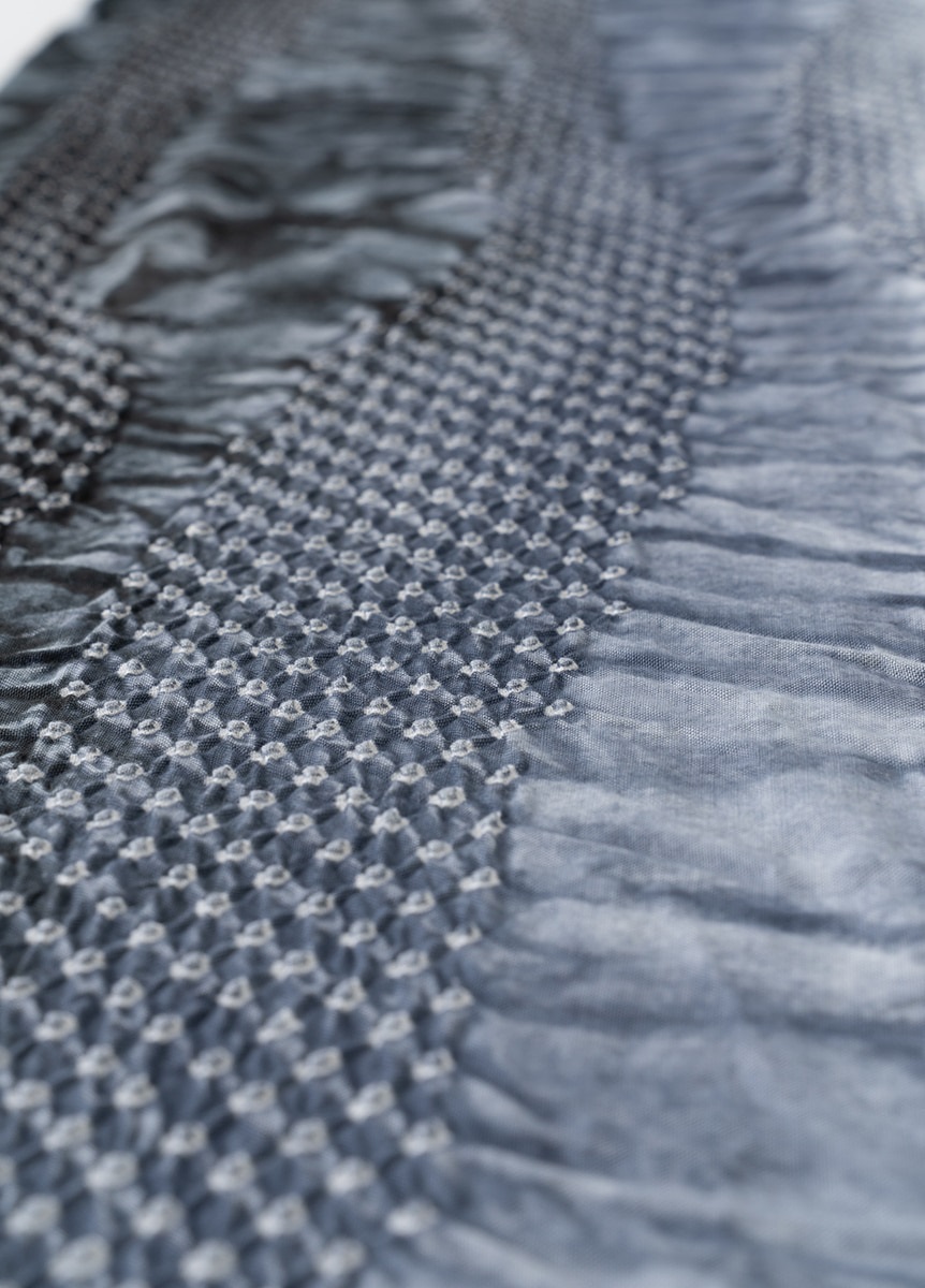 有松鳴海絞りは綿100%の生地に、様々な絞り技法を組み合わせて柄を表現しています。絞りを施すことにより、生地に凹凸が生まれます。そのため、肌との接地面が少なく清涼感へ繋がります。また、綿の柔らかな素材が肌当たり優しく肌心地の良い素材です。