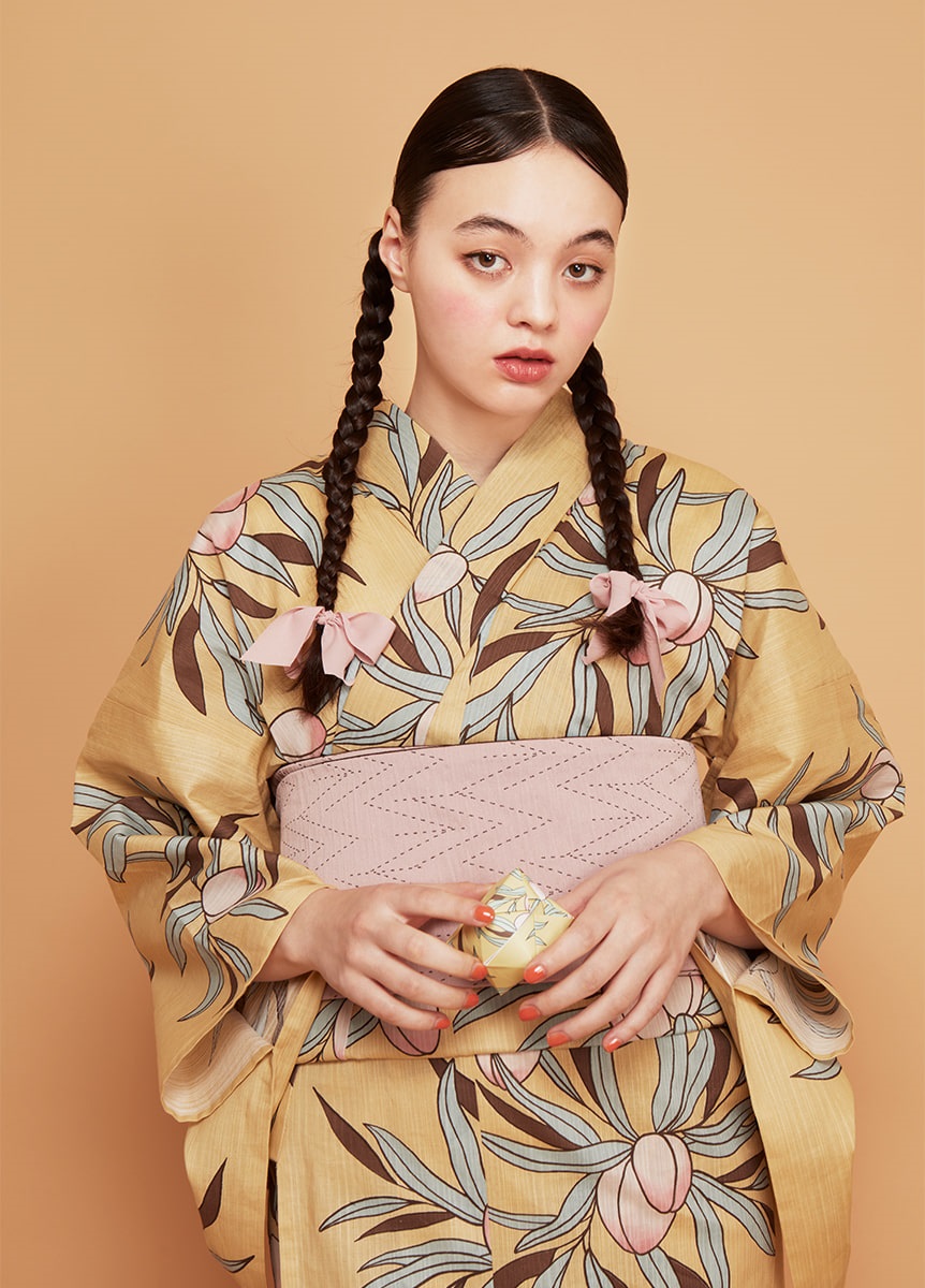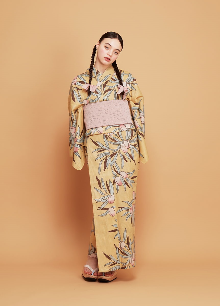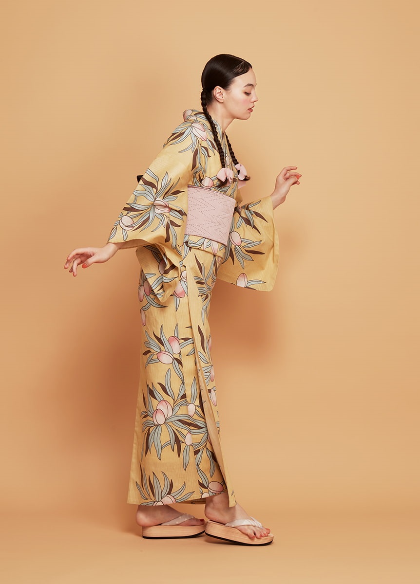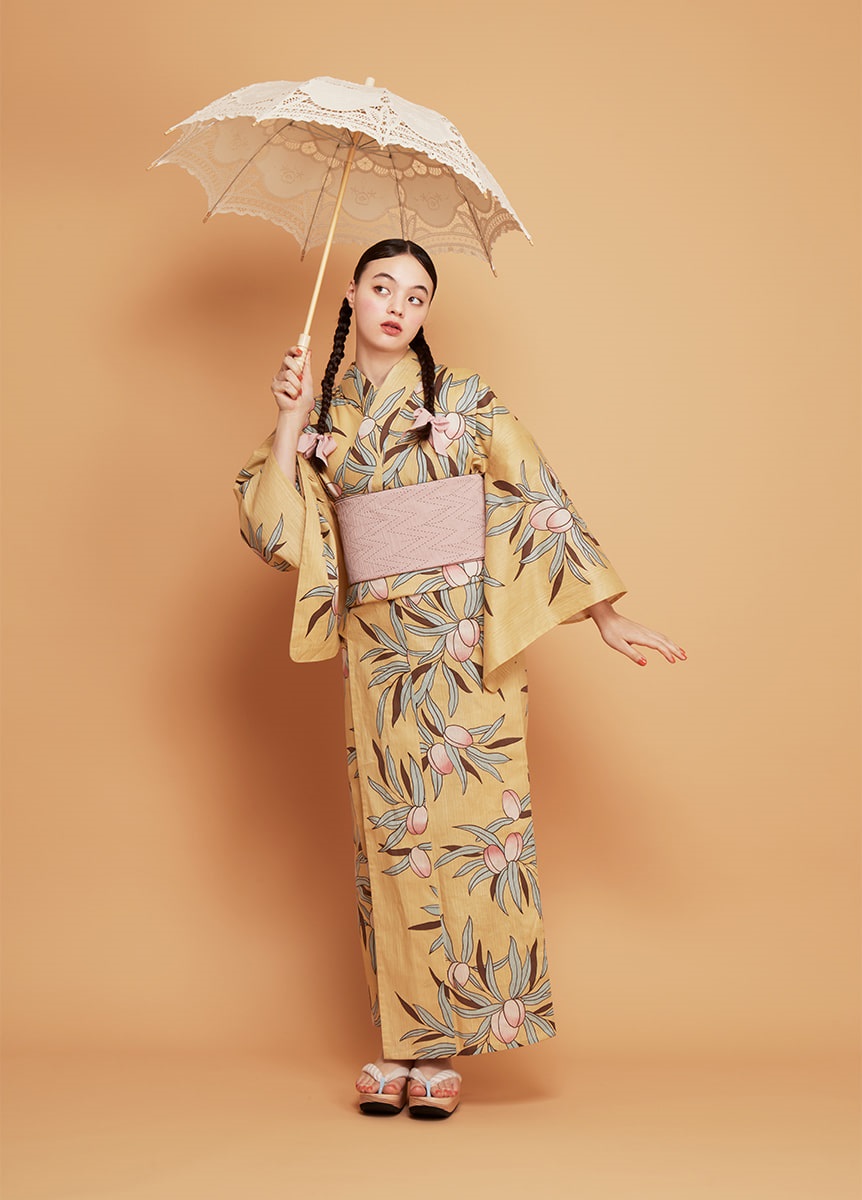 中原淳一がデザインした便箋に描かれたイラスト「ひとり」の少女が着るゆかたを再現しました。全体的に、柔らかな色調で表現した華やかな一枚です。桃を思わせる果実をモチーフにした柄で、夏らしく着姿を彩ります。