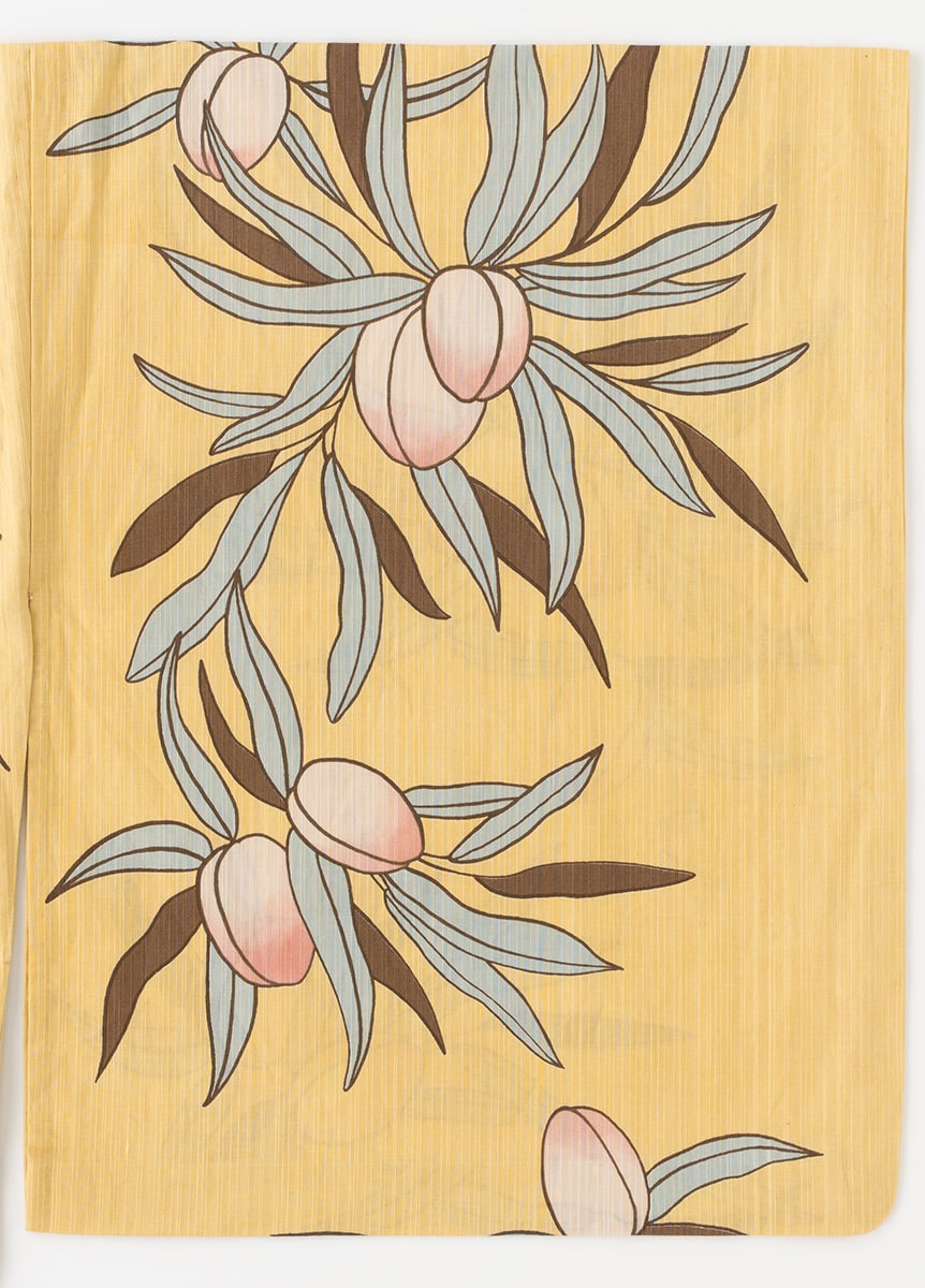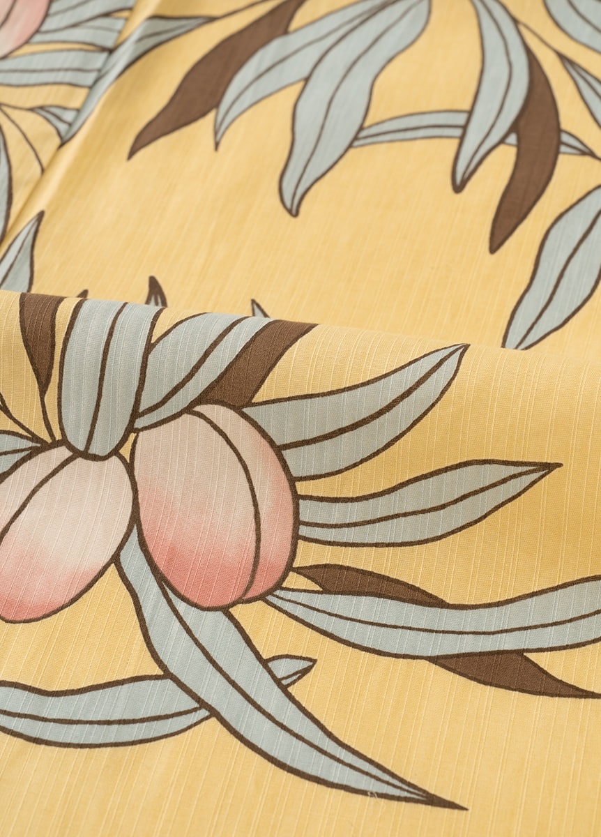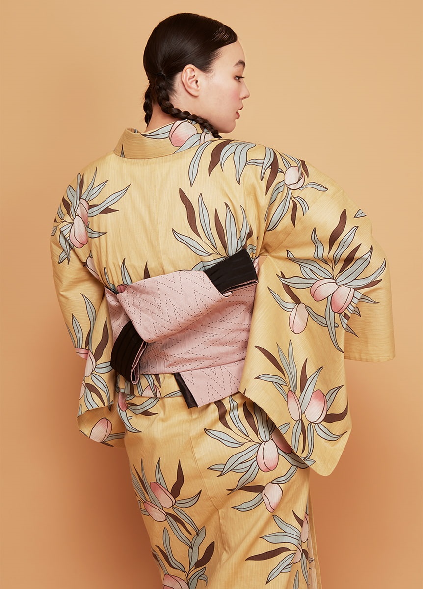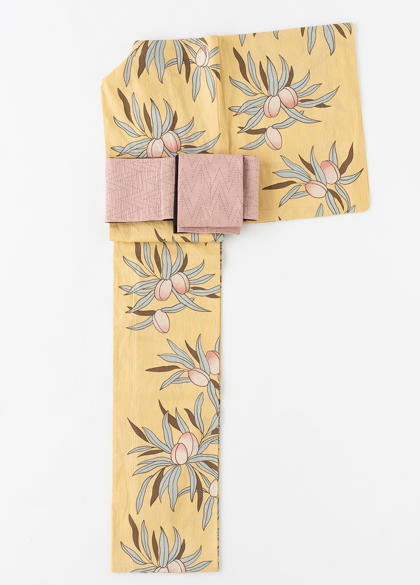 中原淳一がデザインした便箋に描かれたイラスト「ひとり」の少女が着るゆかたを再現しました。全体的に、柔らかな色調で表現した華やかな一枚です。桃を思わせる果実をモチーフにした柄で、夏らしく着姿を彩ります。