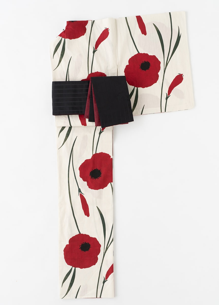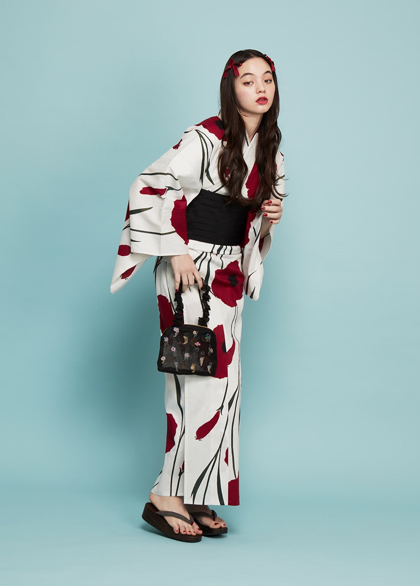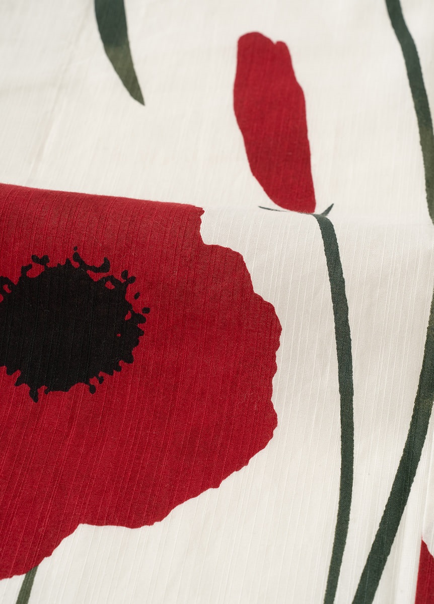 大胆な柄付けと赤の色味にこだわった一枚。花びらは、深みのある2色の赤で表現しました。葉と茎も2色の緑色で表現し、流れを感じる柄行きで着姿を彩ります。中原淳一が「スケッチ帖」に描いた少女のイラストから再現しました。