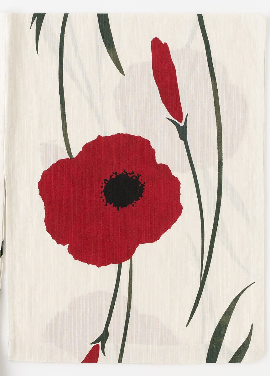 色数分の型を使用して染色するオートスクリーン捺染の技法を用いて表現しています。「赤い花」では、5枚の型を使用して表現しました。