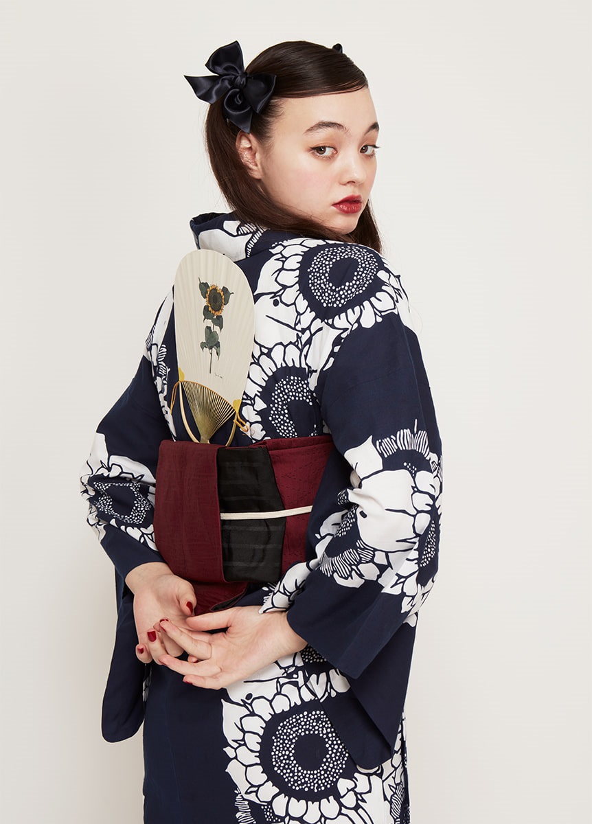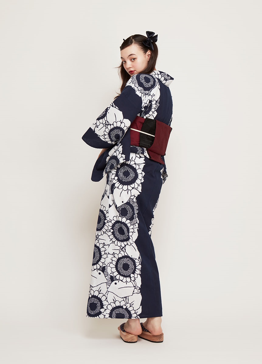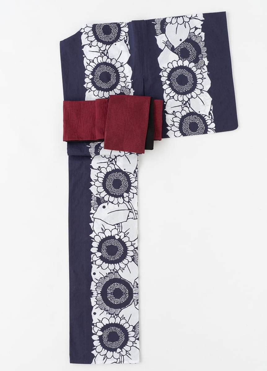 反物の中心にひまわりを連ねて表現した、大胆で夏らしい一枚。紺と白のコントラストが効いた配色で、華やかに装うデザインです。