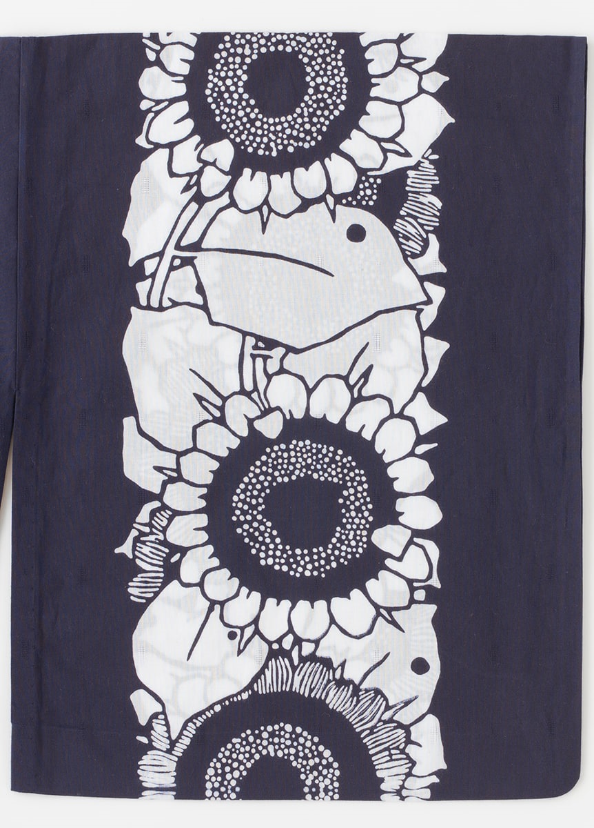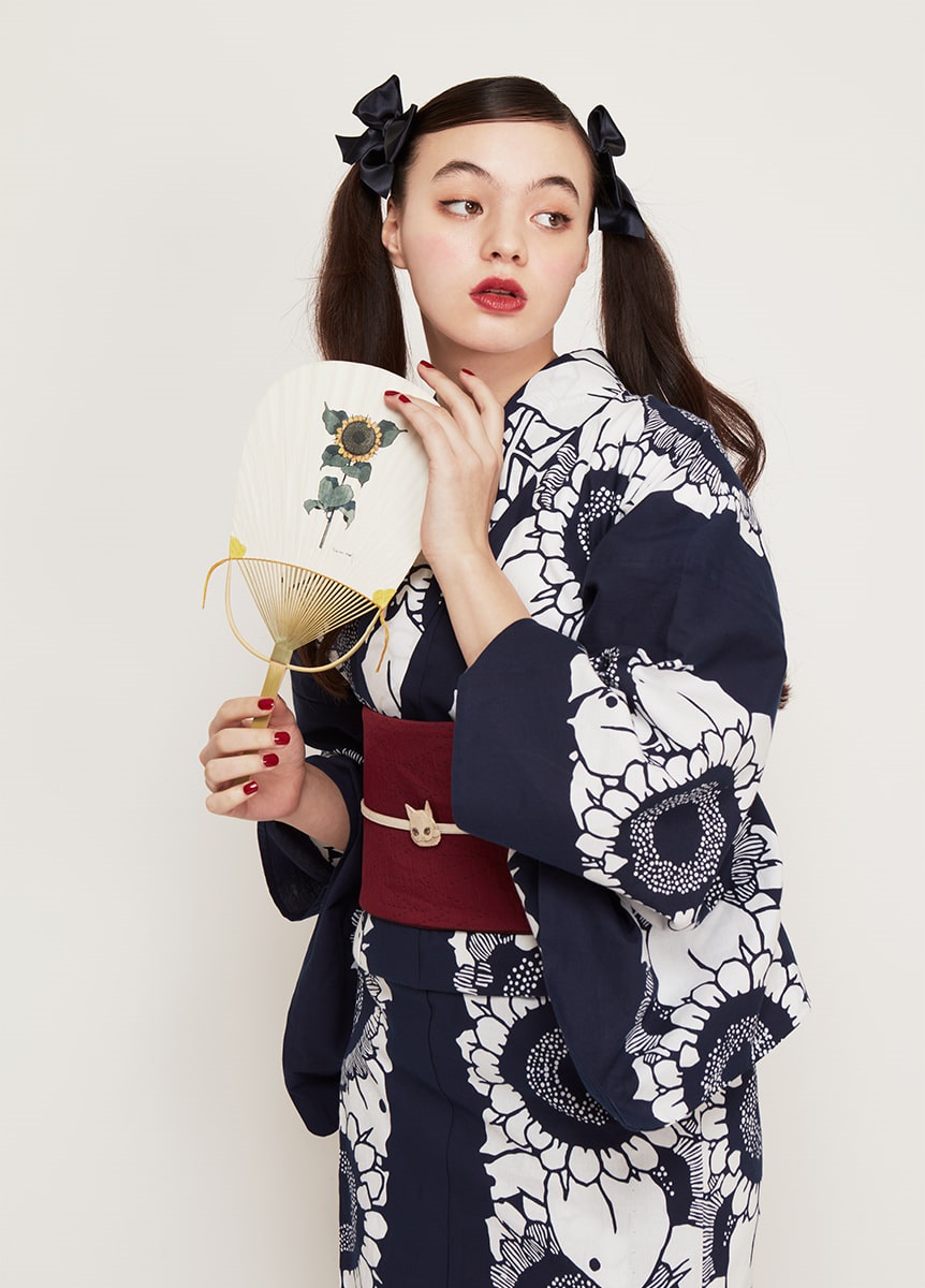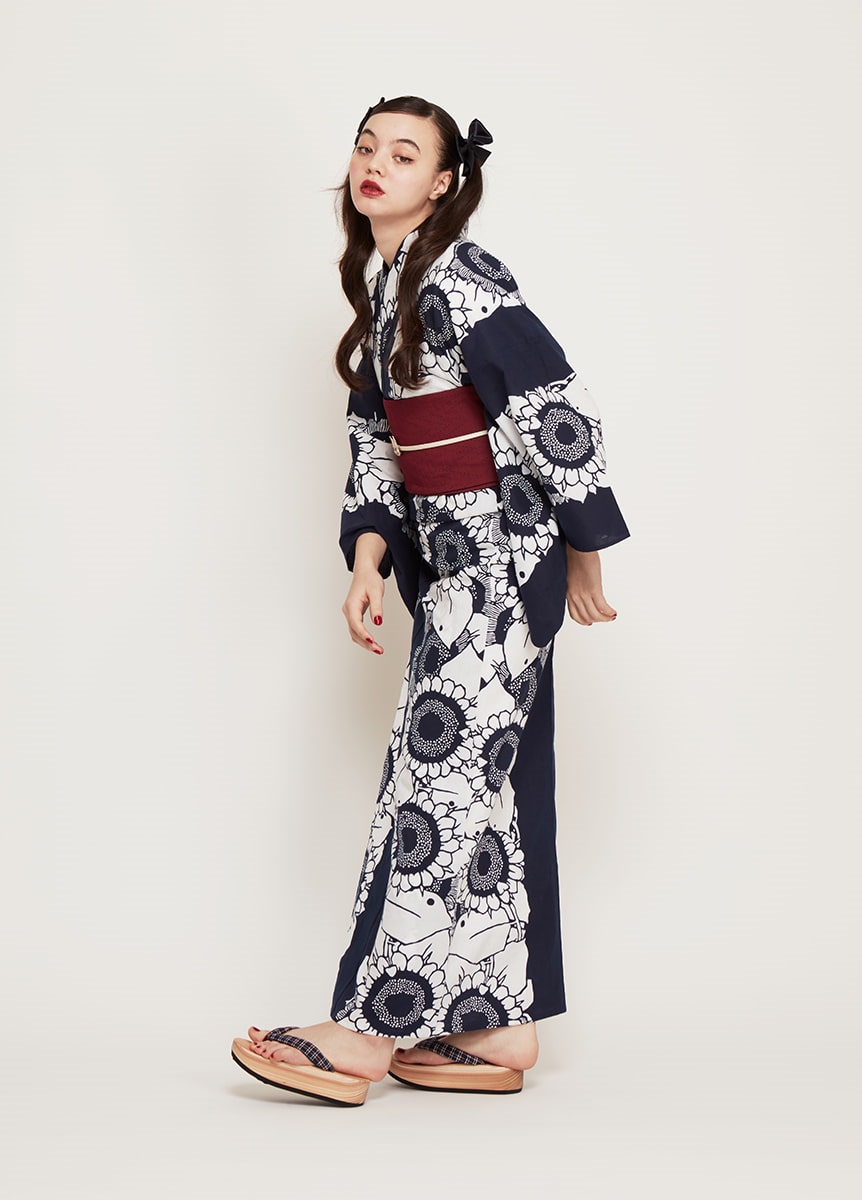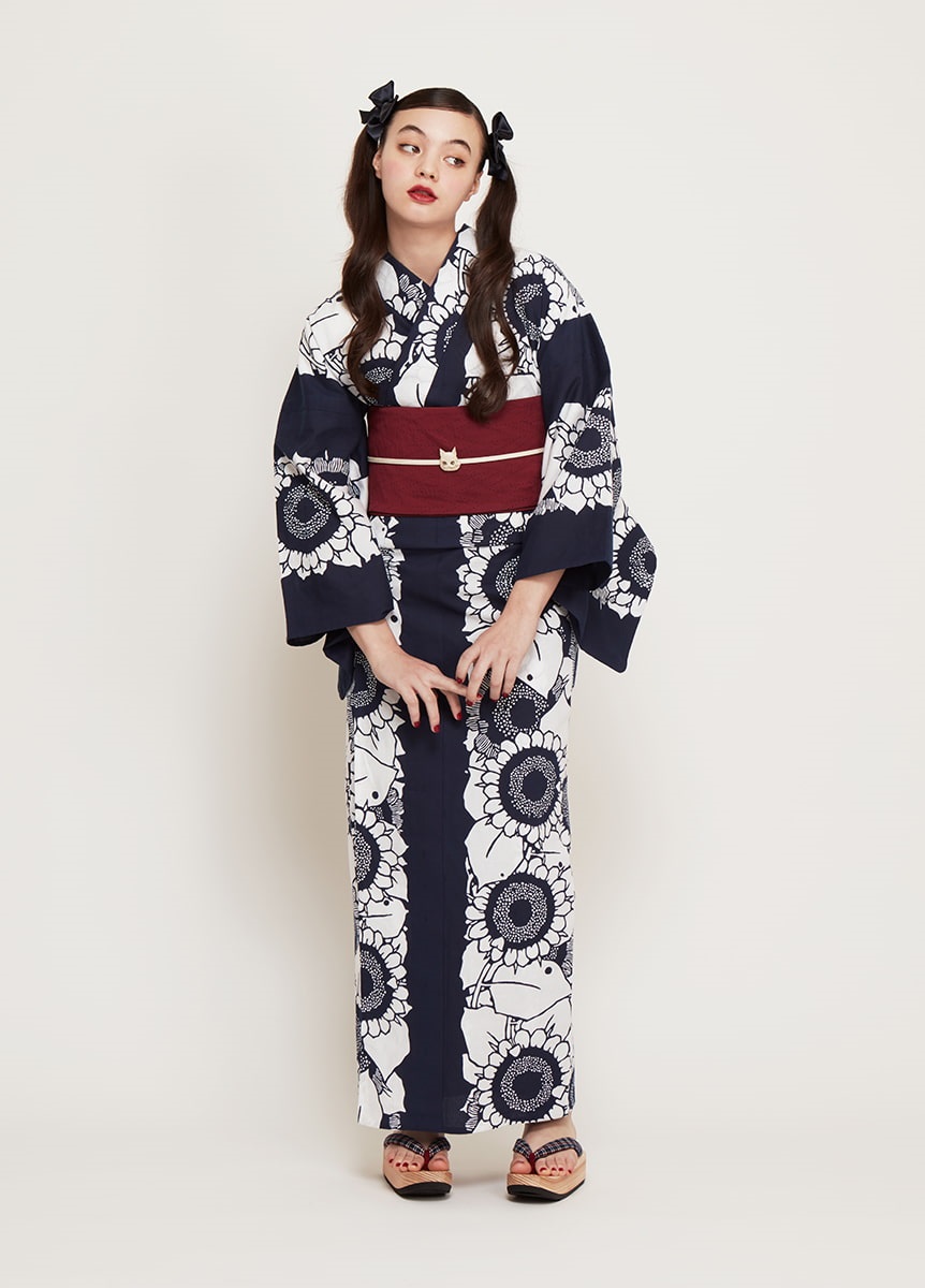 反物の中心にひまわりを連ねて表現した、大胆で夏らしい一枚。紺と白のコントラストが効いた配色で、華やかに装うデザインです。