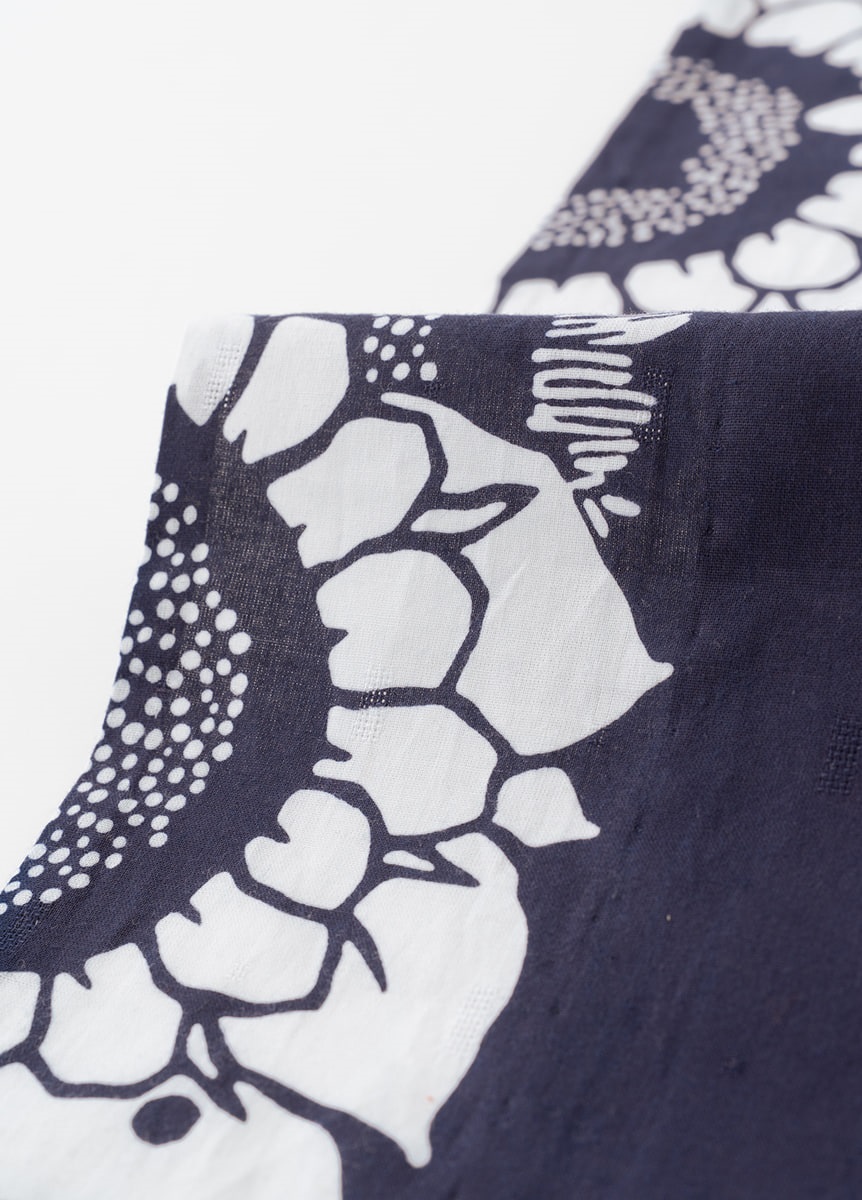 昭和30年代のはじめに中原淳一「それいゆ ゆかた」として発売され、人気を博したゆかたの復刻デザインです。生地を折りたたんで染めることで、繰り返し模様を表現する注染で表現しています。