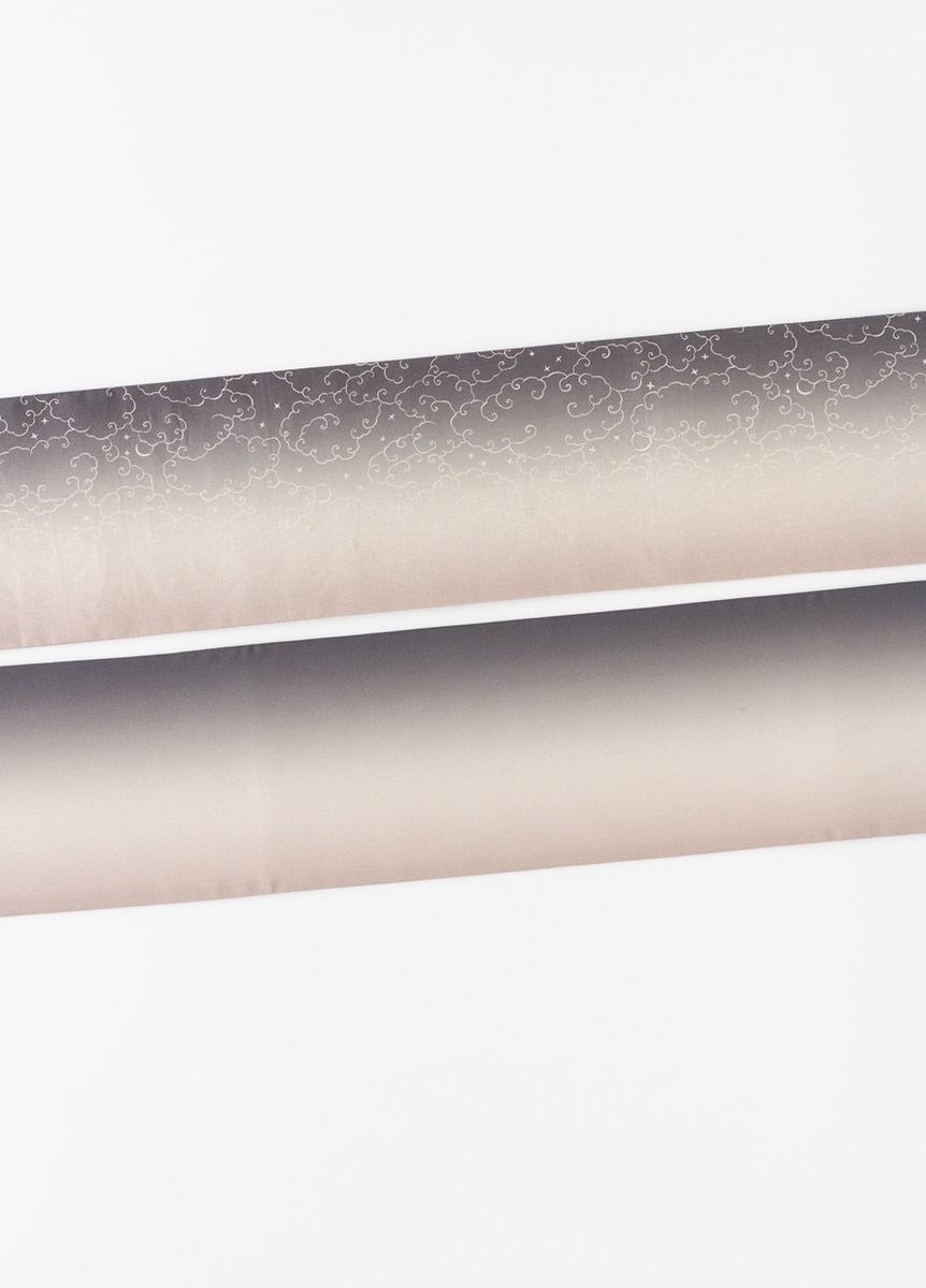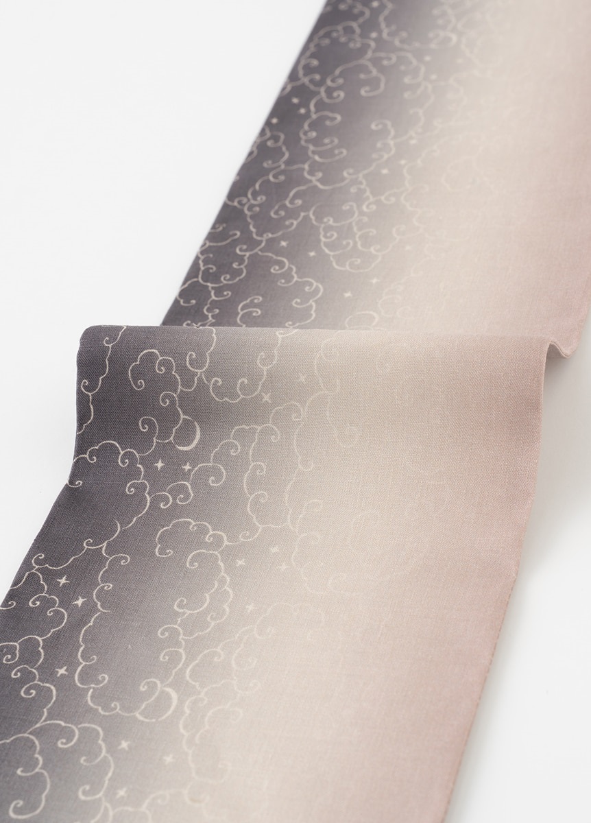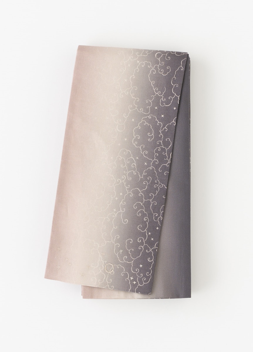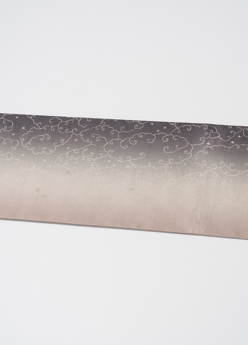 夏の空が一日の中で刻々と色を変えていく、その一瞬の美しさを切り取り、グラデーションで表現した帯です。夕暮れと夜明け、それぞれの空をイメージし、光りと影が静かに溶け合うような奥行きのある色合いです。さりげなく配した星と月の刺繍が、夏の装いに涼やかな余韻を残します。