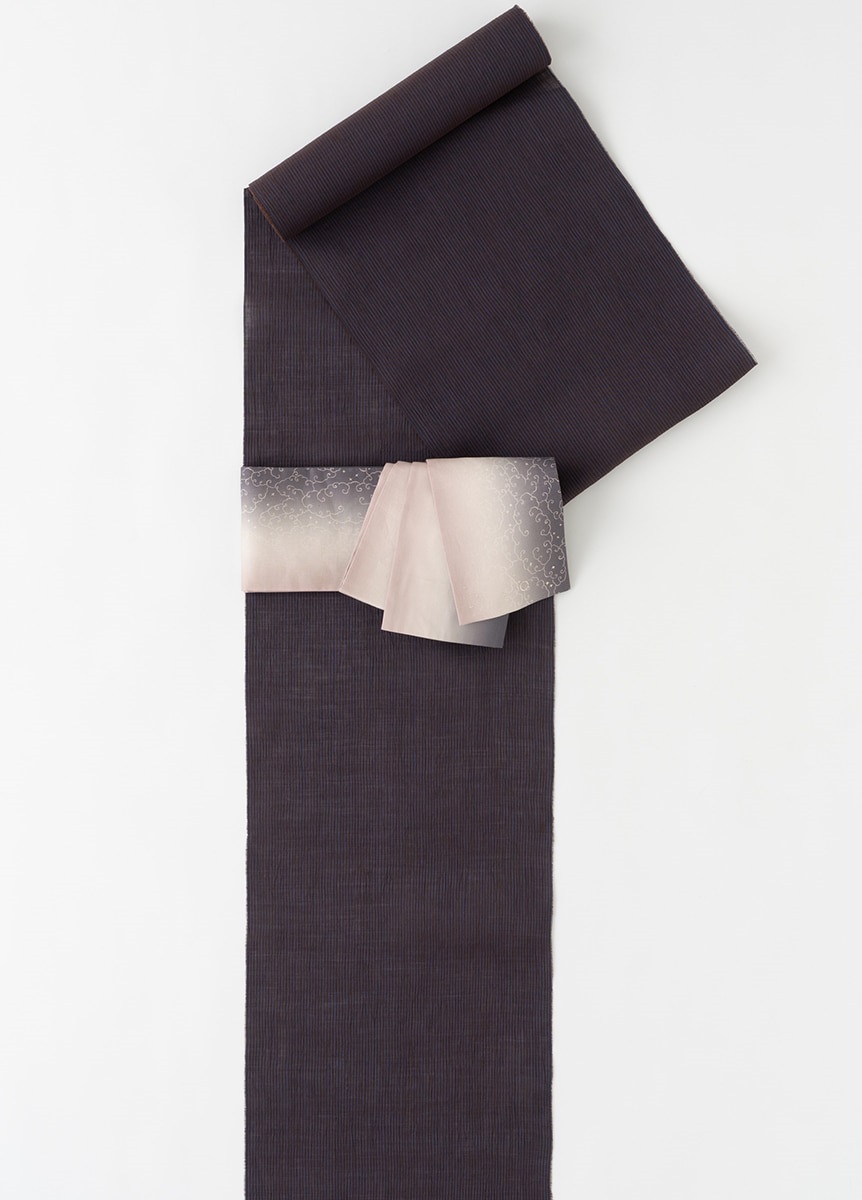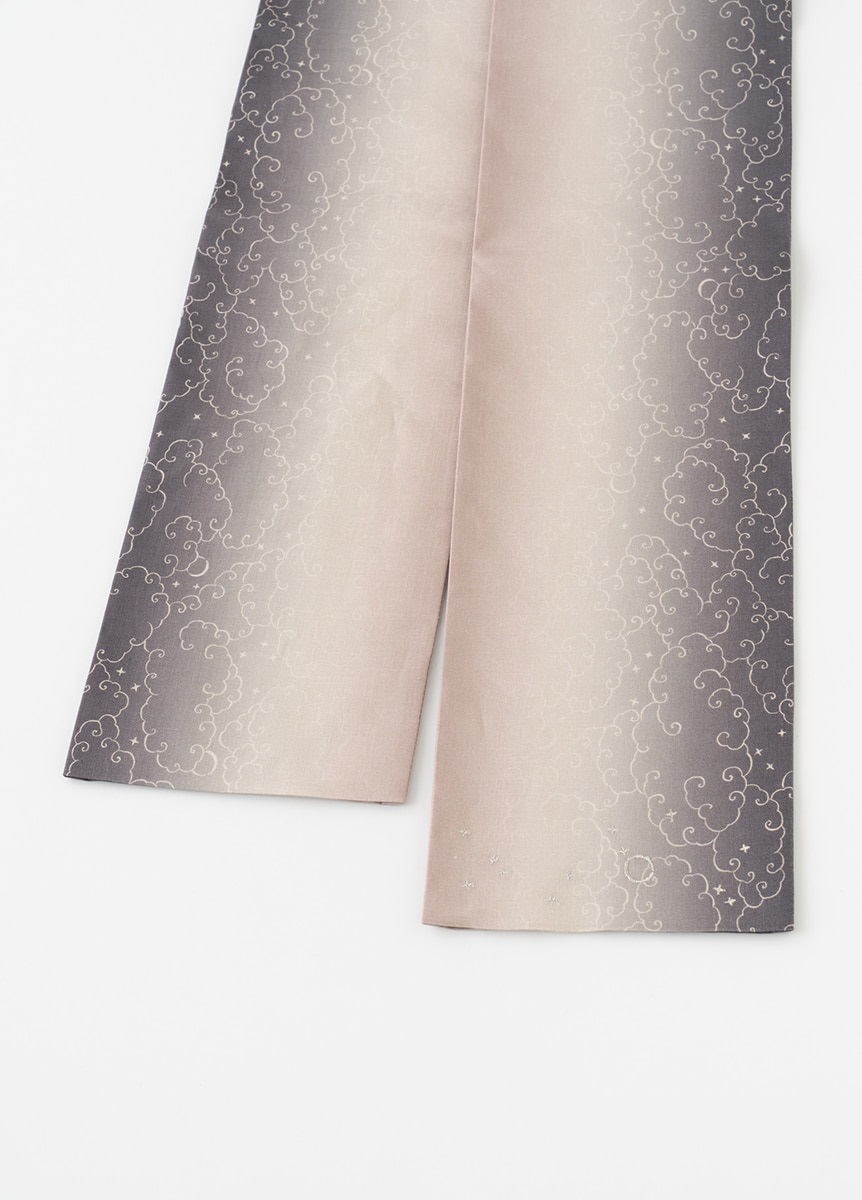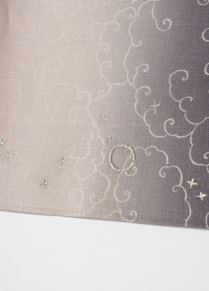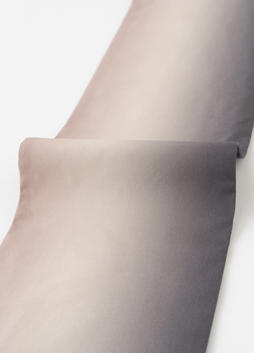 夏の空が一日の中で刻々と色を変えていく、その一瞬の美しさを切り取り、グラデーションで表現した帯です。夕暮れと夜明け、それぞれの空をイメージし、光りと影が静かに溶け合うような奥行きのある色合いです。さりげなく配した星と月の刺繍が、夏の装いに涼やかな余韻を残します。