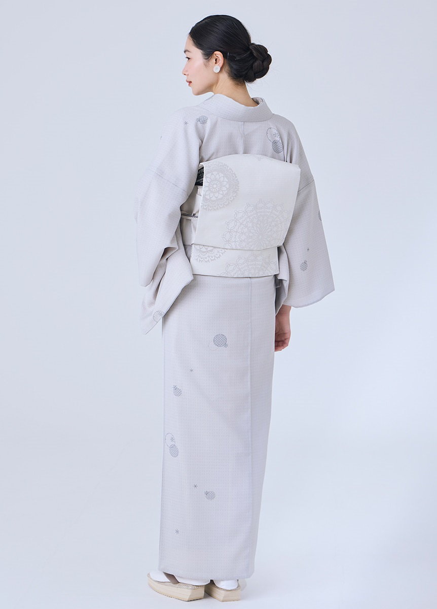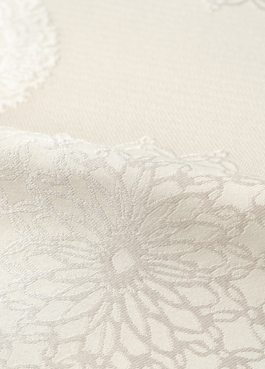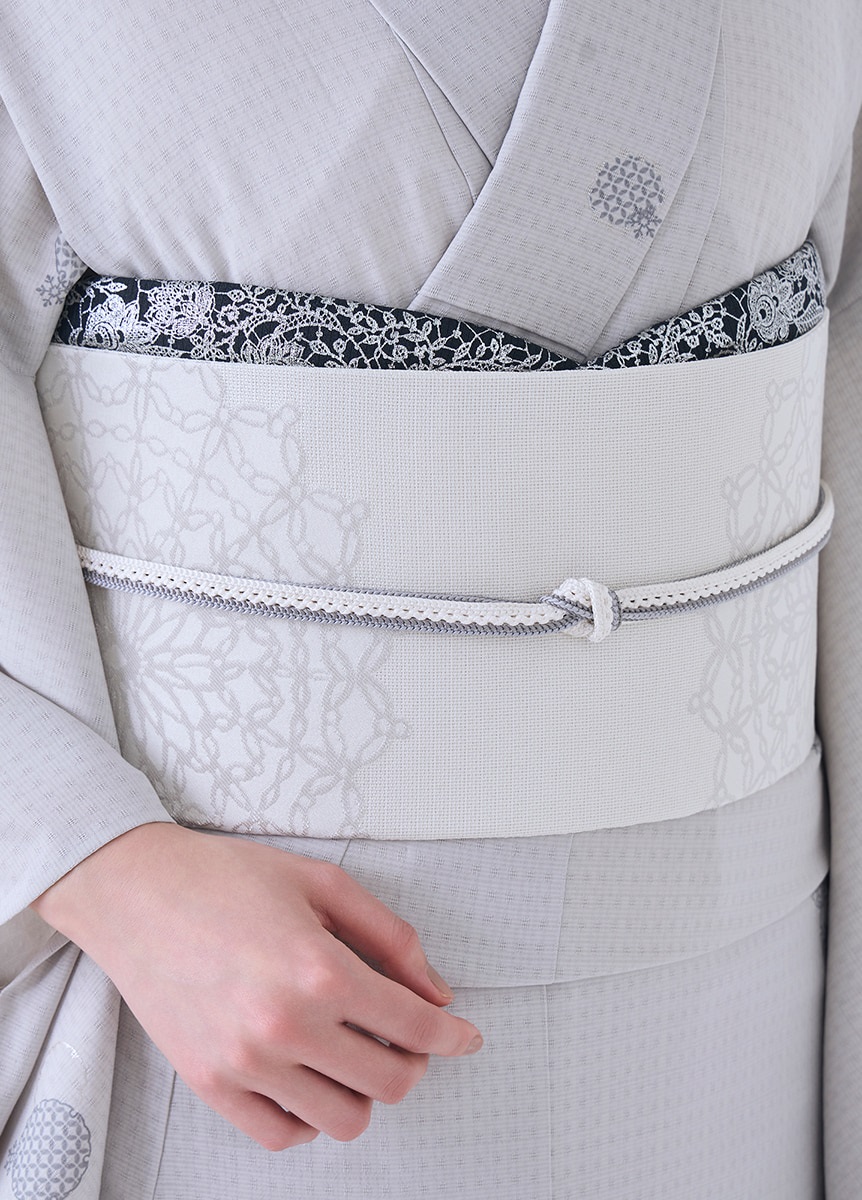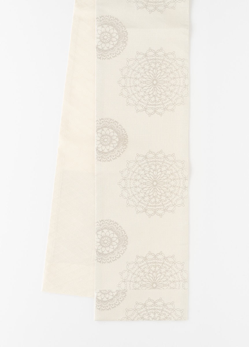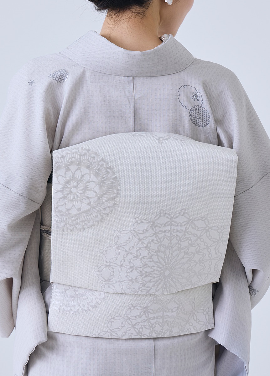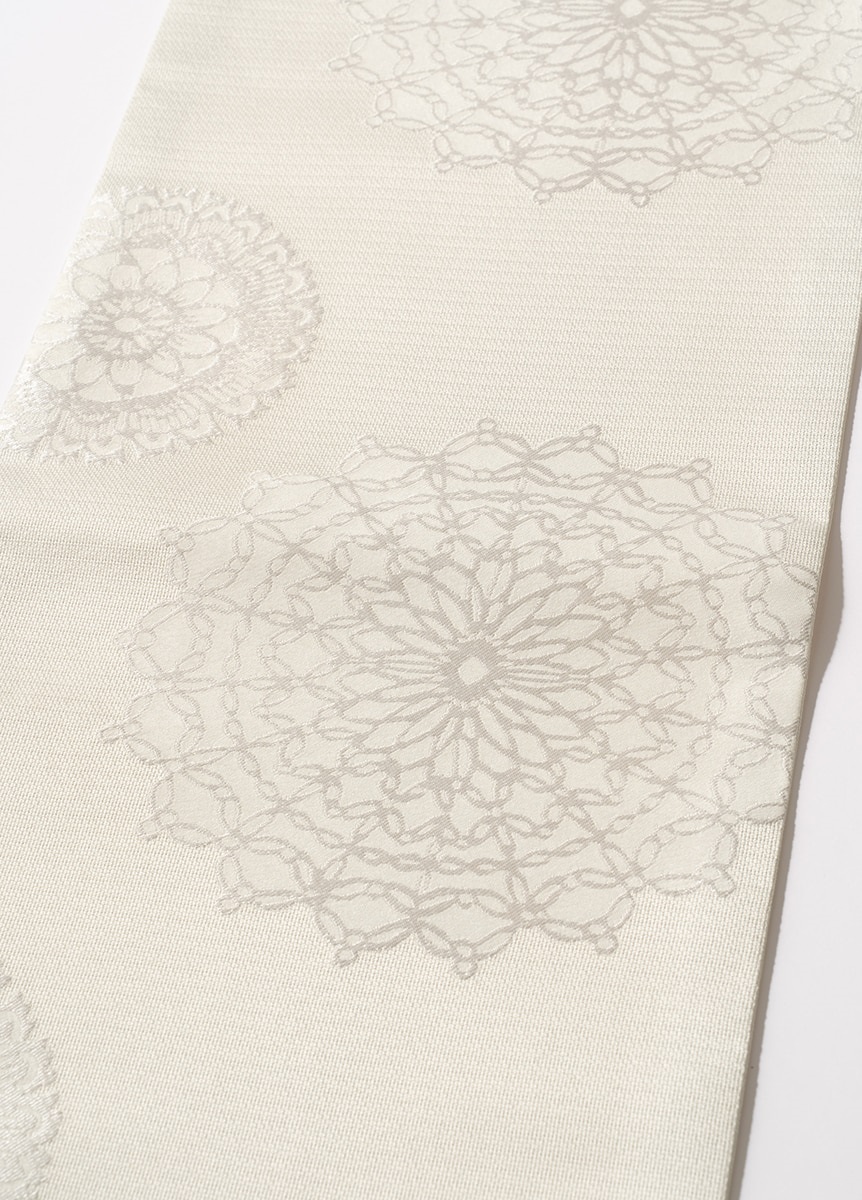 光沢感のある緯糸で柄を織り出した、ハリ感のある帯地です。白基調の色合いで表現した上品なデザインの為、綺麗めな装いやお出かけのシーンにぴったりな帯です。季節感問わず楽しめる柄と生地感なので、シーズンフリーでお楽しみいただけるアイテムです。