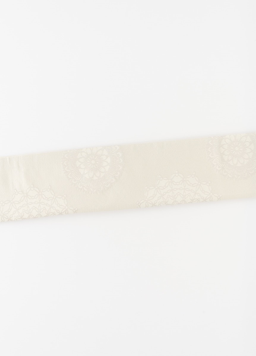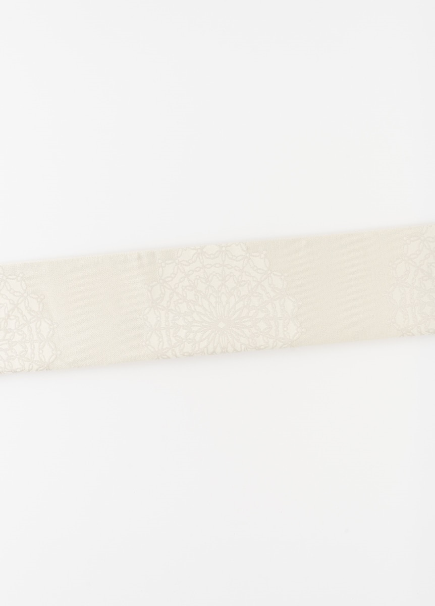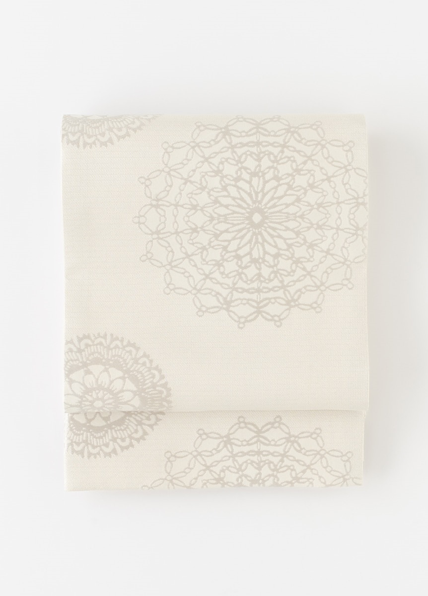 上品なレース調の華紋柄であしらったデザインです。女性らしさのある柄の為、綺麗めなスタイルや可憐な着姿にぴったりの帯です。