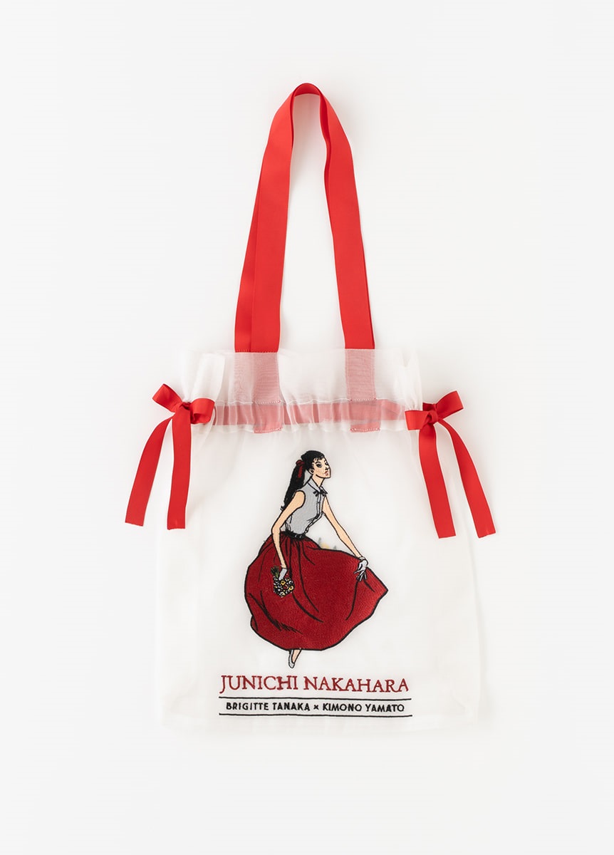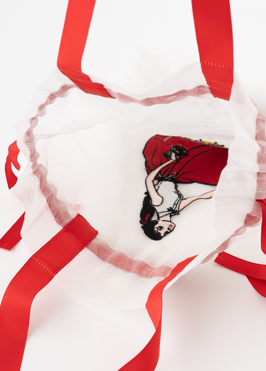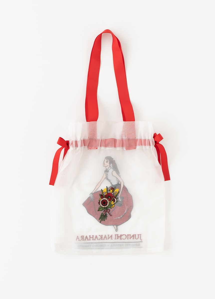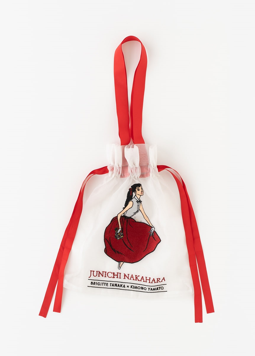 透けるオーガンジー素材に象徴的な刺繍を入れたデザインは、ゆかたにも普段使いにもぴったり。見た目以上にタフで、驚くほど軽いバッグです。中原淳一の代表的なイラストである赤いスカートを履いた女性のスタイル画を刺繍で施しました。一見、プリントのようにも見える緻密な刺繍で、赤いスカートの光沢感を再現しています。ゆかたスタイルでは、両サイドの紐を絞って巾着のようにしたコンパクトなサイズ感がおすすめ。洋服では絞らずトートバッグのようにすると、A4サイズで肩掛けもできます。