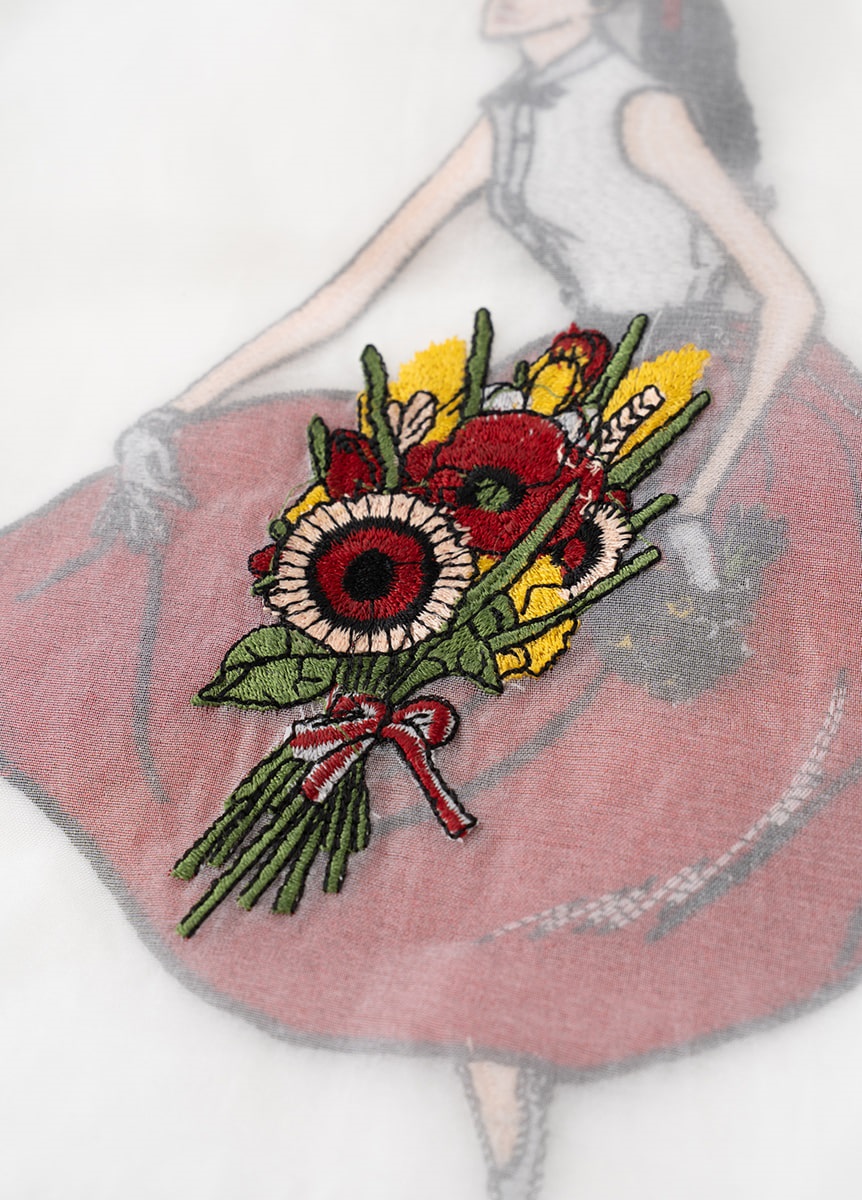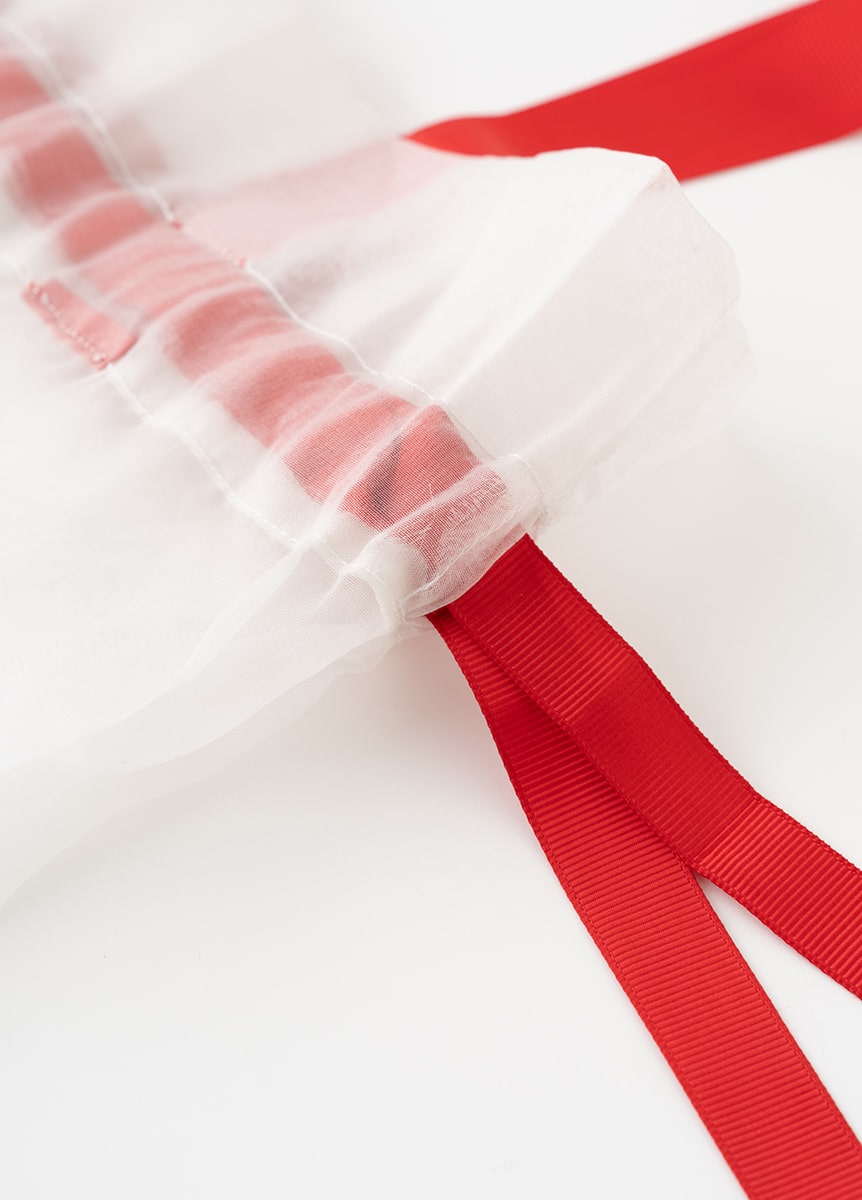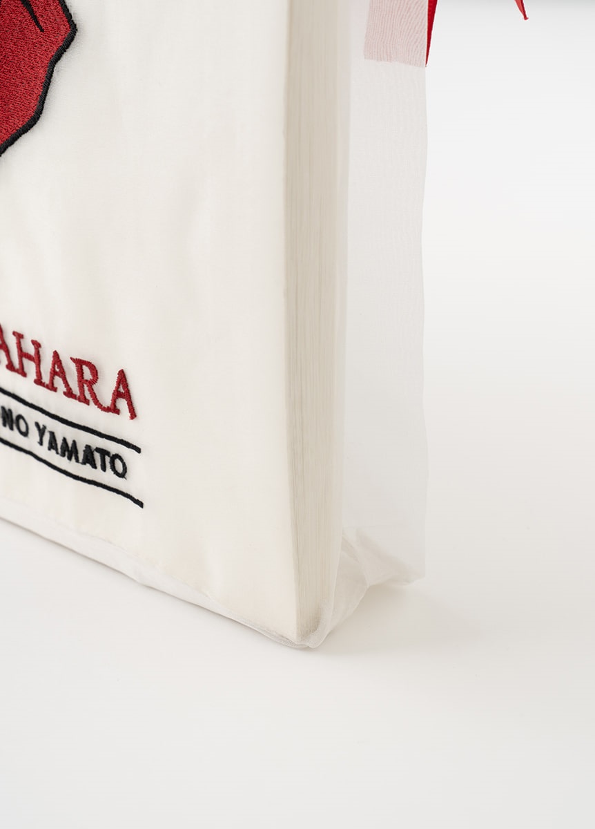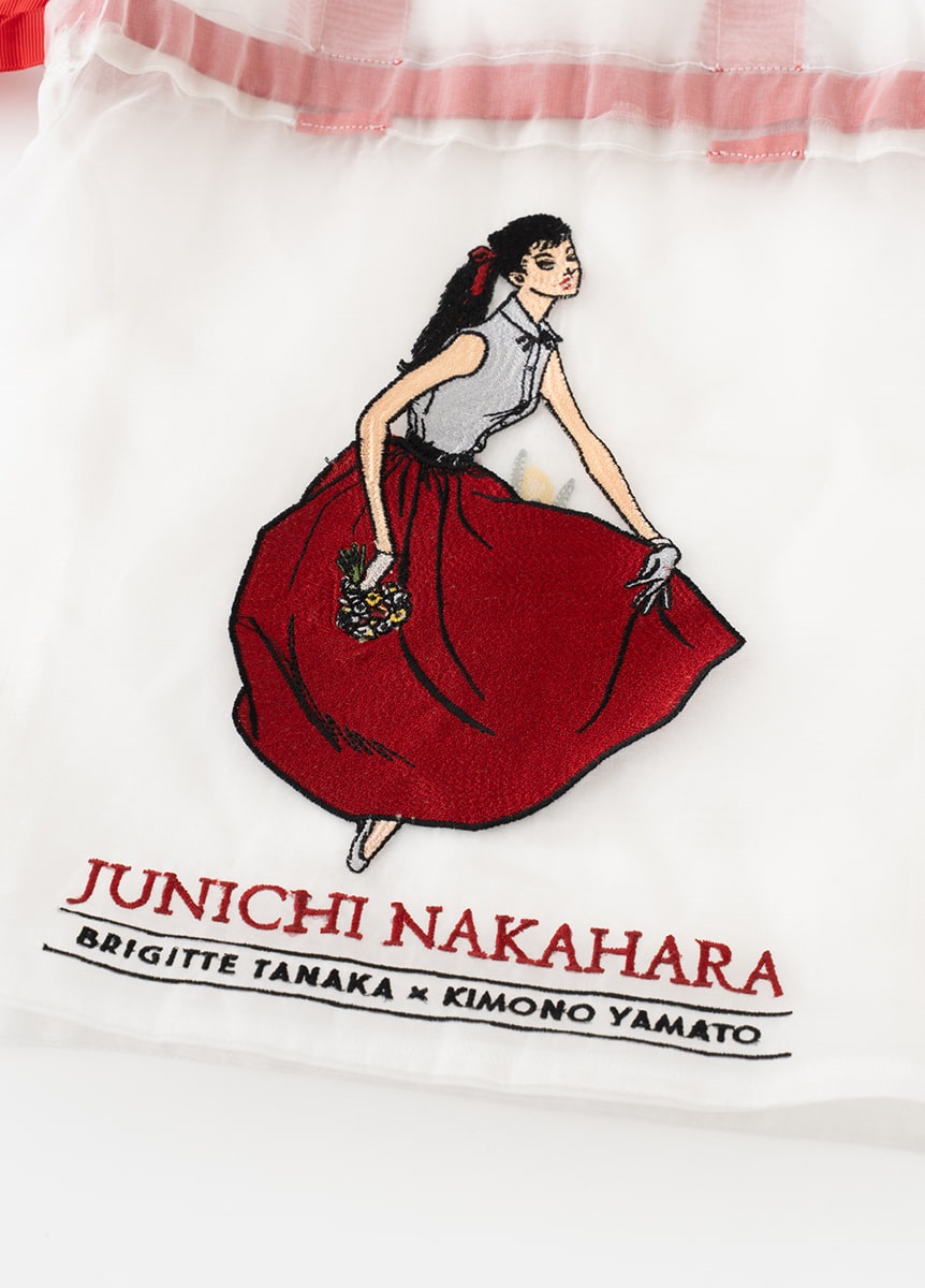 透けるオーガンジー素材に象徴的な刺繍を入れたデザインは、ゆかたにも普段使いにもぴったり。見た目以上にタフで、驚くほど軽いバッグです。中原淳一の代表的なイラストである赤いスカートを履いた女性のスタイル画を刺繍で施しました。一見、プリントのようにも見える緻密な刺繍で、赤いスカートの光沢感を再現しています。ゆかたスタイルでは、両サイドの紐を絞って巾着のようにしたコンパクトなサイズ感がおすすめ。洋服では絞らずトートバッグのようにすると、A4サイズで肩掛けもできます。