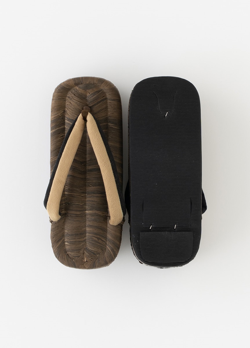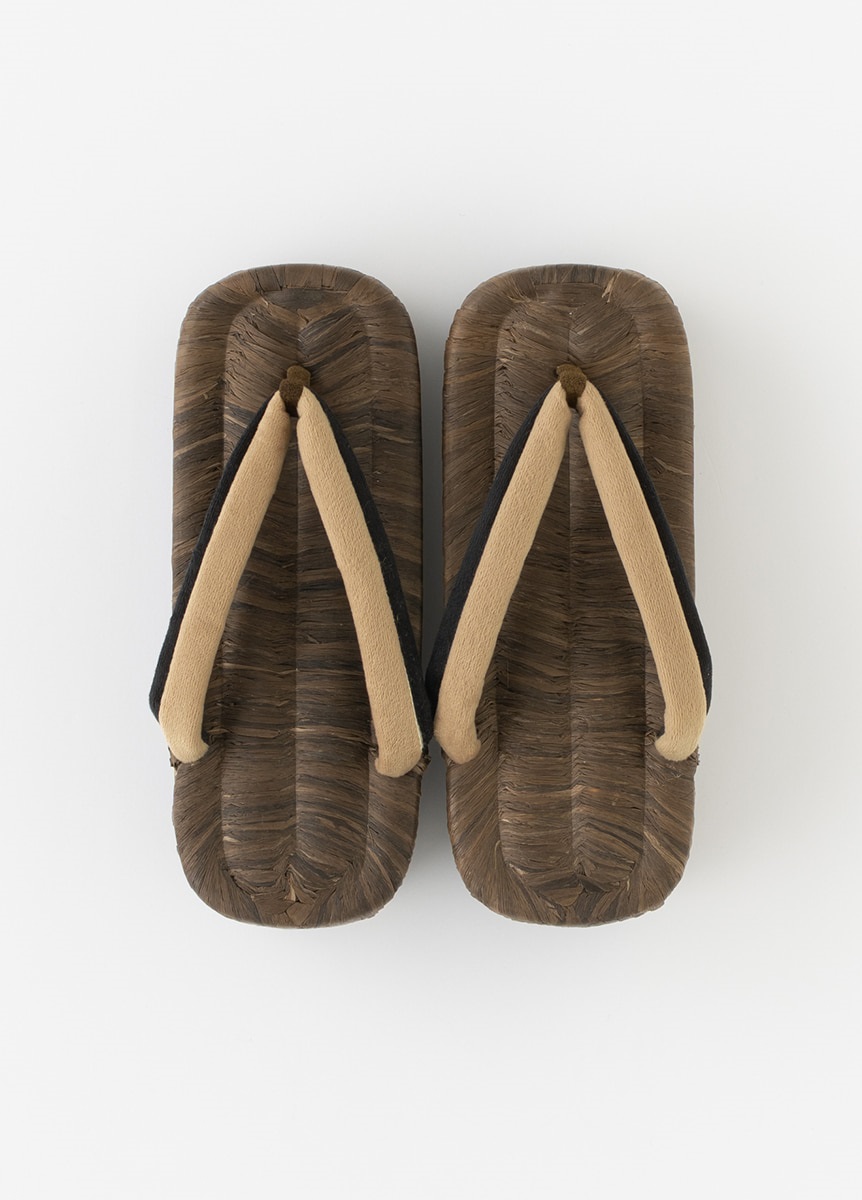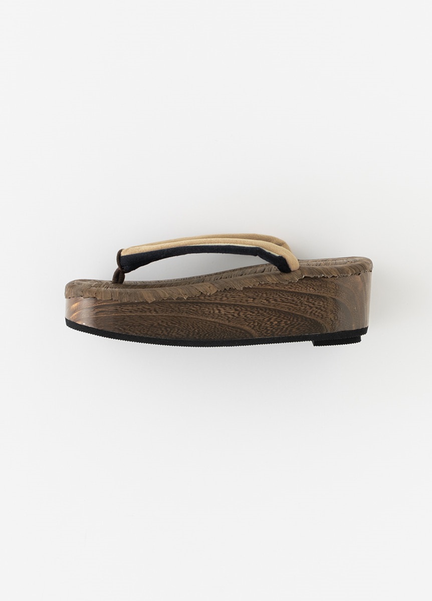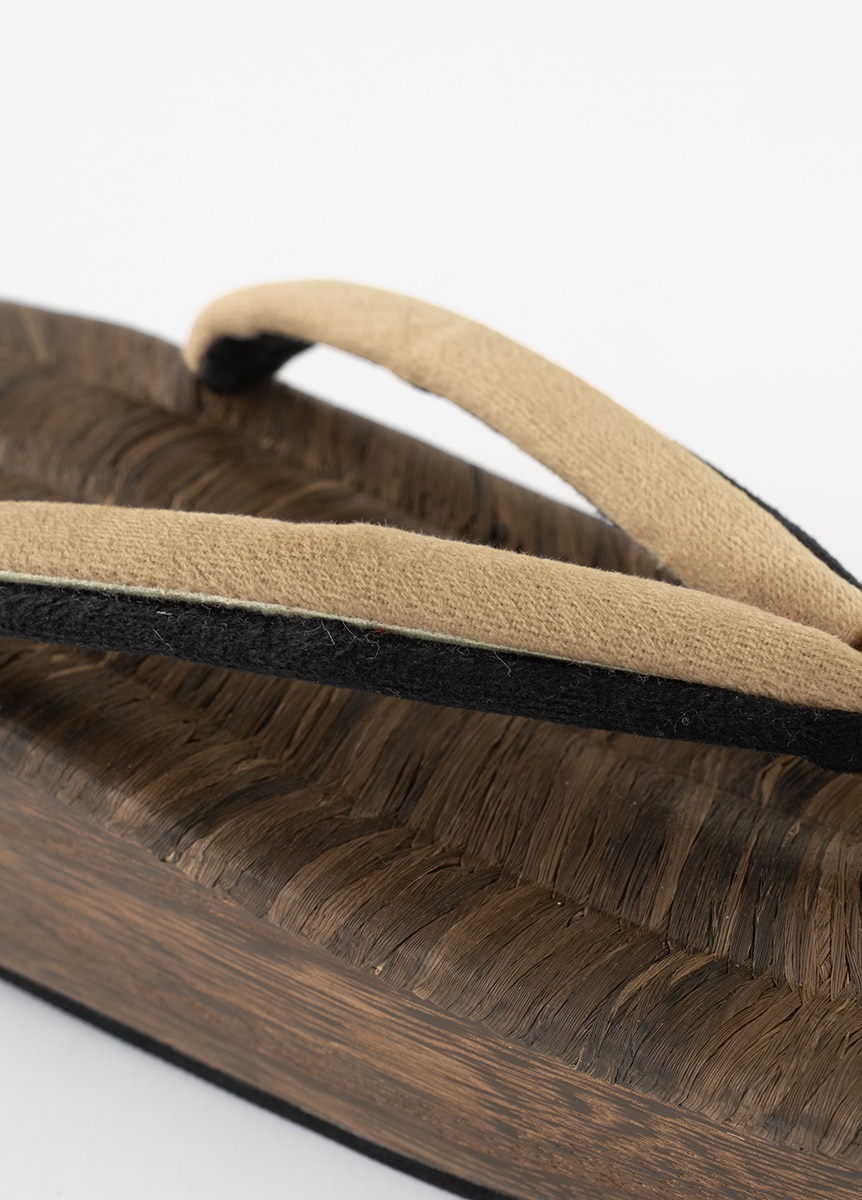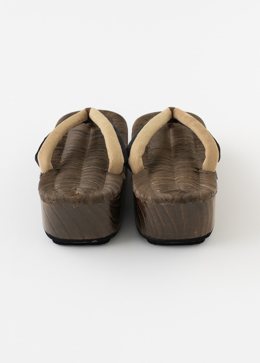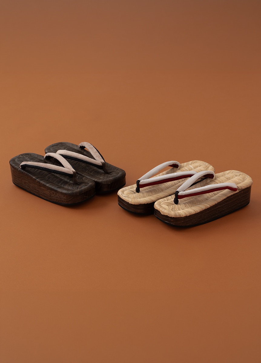 こだわった履き物で足元のお洒落を楽しむ人が増えた時代でもある江戸をイメージした、畳表の台と2色のベロア生地の鼻緒を合わせた下駄です。舟形で、夏だけでなく通年ご使用いただけます。
