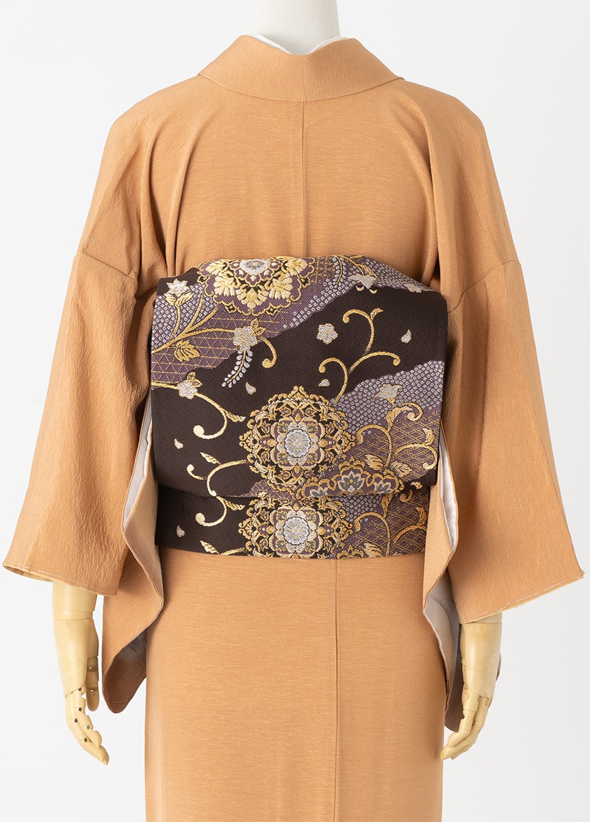 華文と唐草をデザインした袋帯です。濃地の帯で着姿をすっきりと引き締めます。