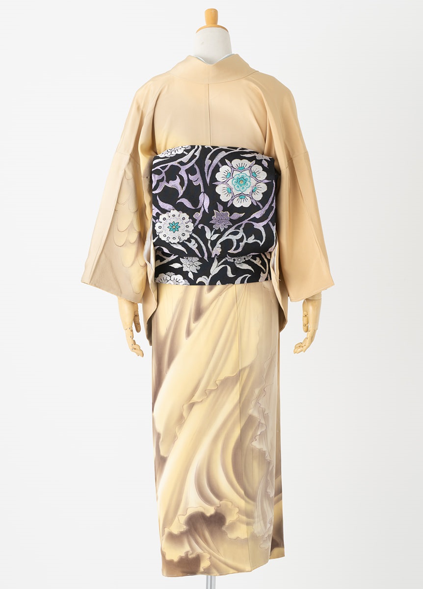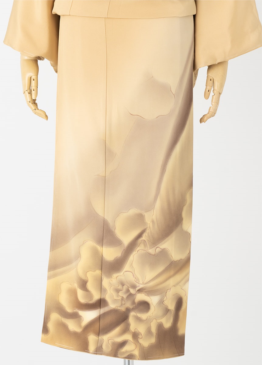 サモトラケのニケ像をモチーフに製作したオリジナルデザインの訪問着です。美しいひだを繊細なぼかしで表現しました。左の外袖にはニケ像の特徴である翼が描かれています。