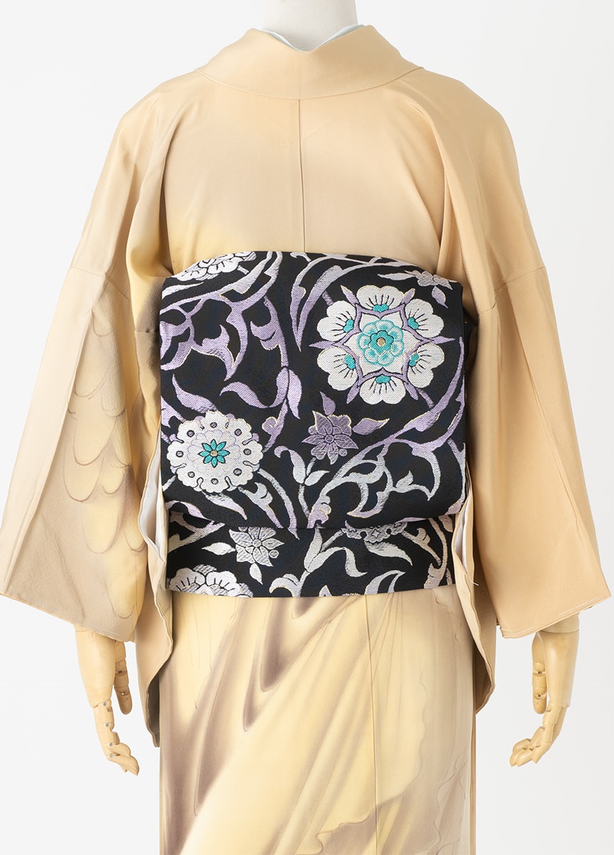 黒地に大胆な唐花模様の袋帯です。モダンな訪問着に合わせてスタイリッシュな雰囲気でお楽しみください。