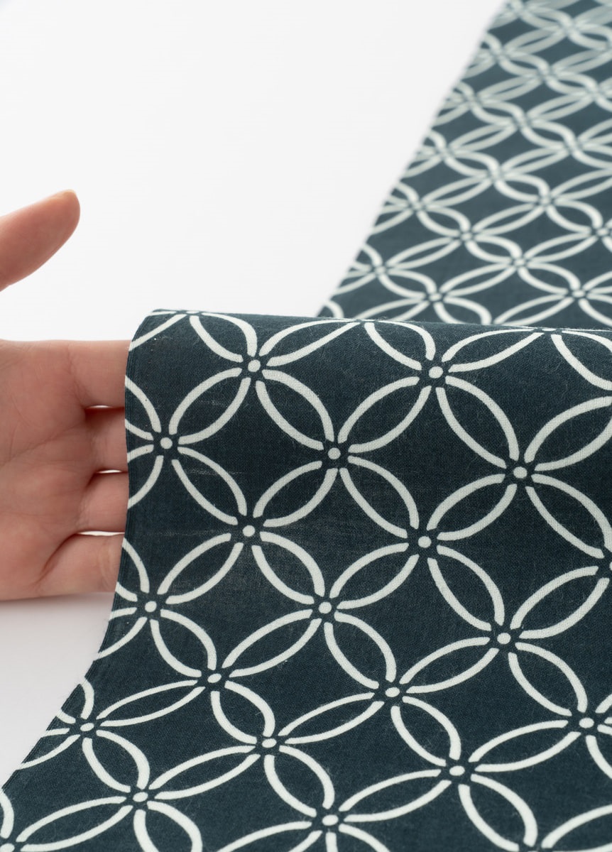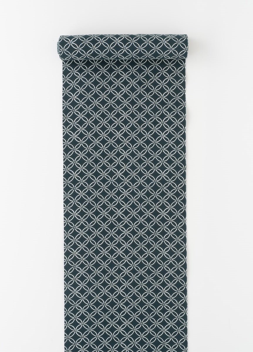 紺地に白の七宝柄というベーシックな柄付けです。シンプルなゆかたのため、帯や小物合わせをお楽しみいただけます。