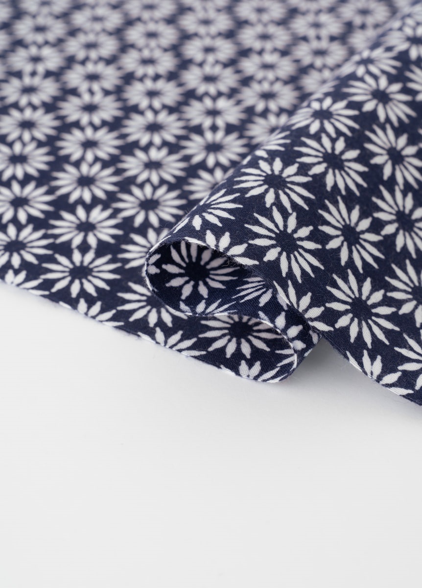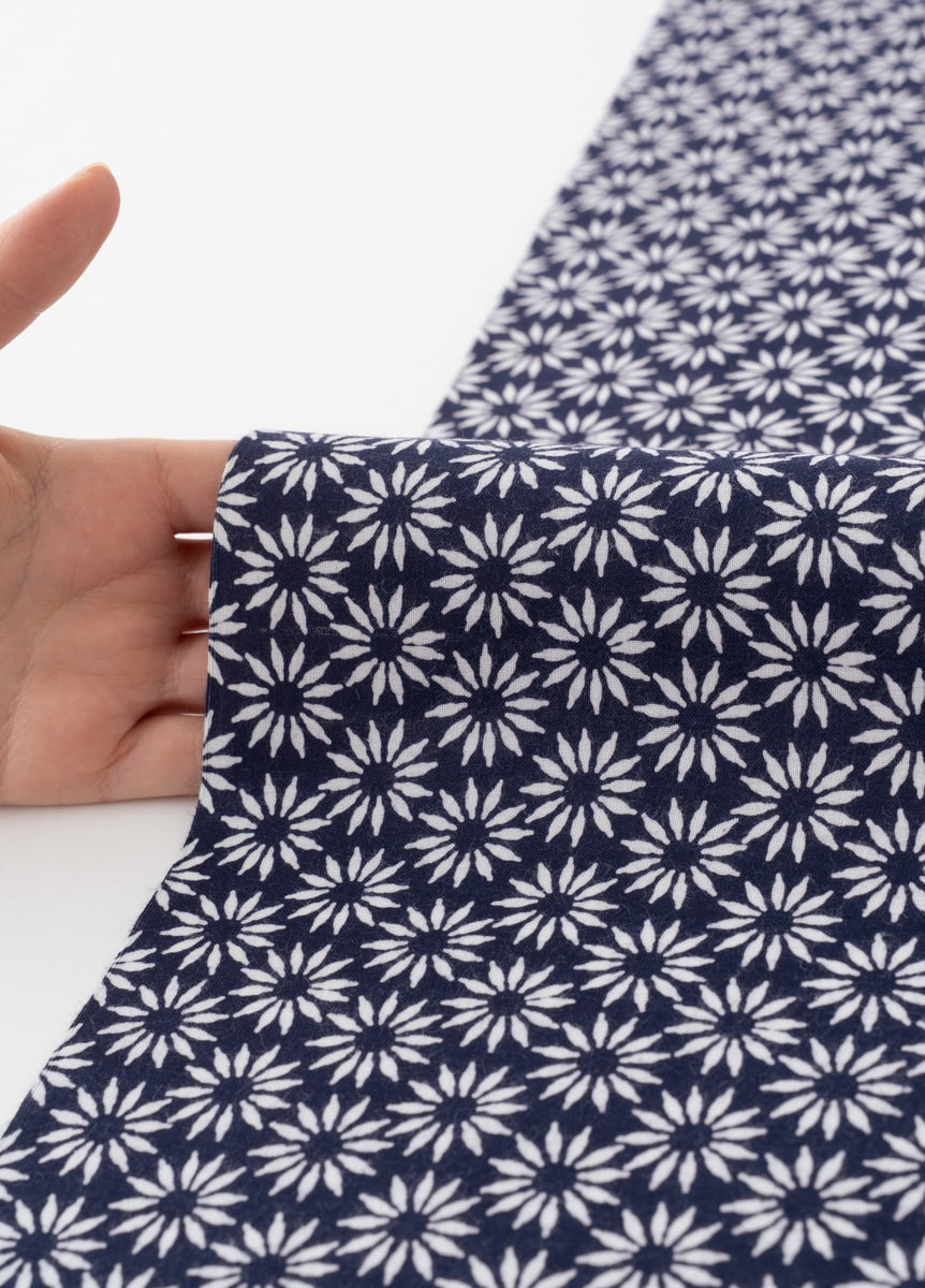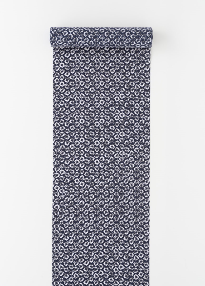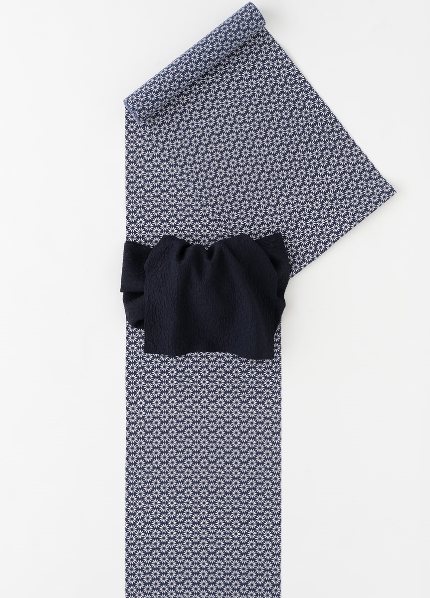 紺地に白の菊柄というベーシックな柄付けです。シンプルなゆかたのため、帯や小物合わせをお楽しみいただけます。