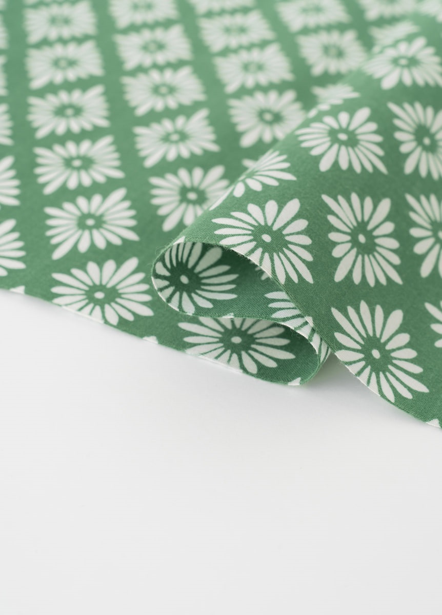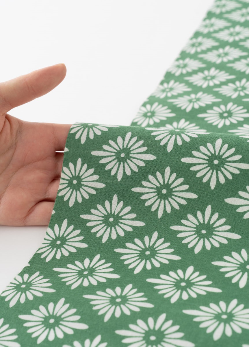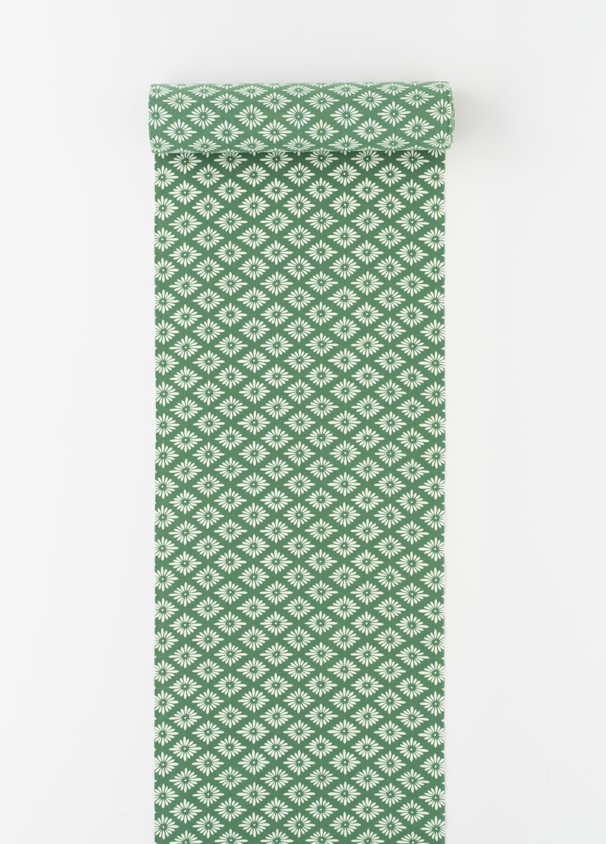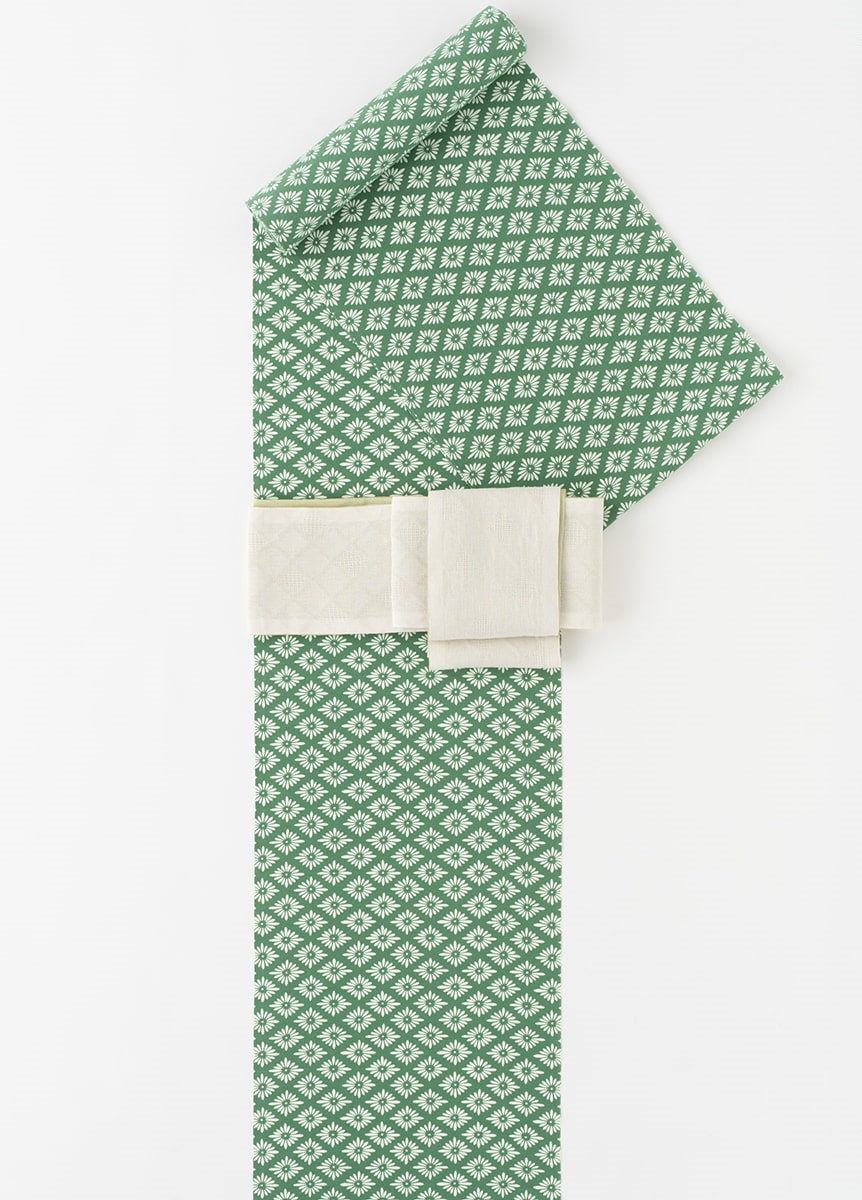 緑地に白の花菱柄というベーシックな柄付けです。シンプルなゆかたのため、帯や小物合わせをお楽しみいただけます。