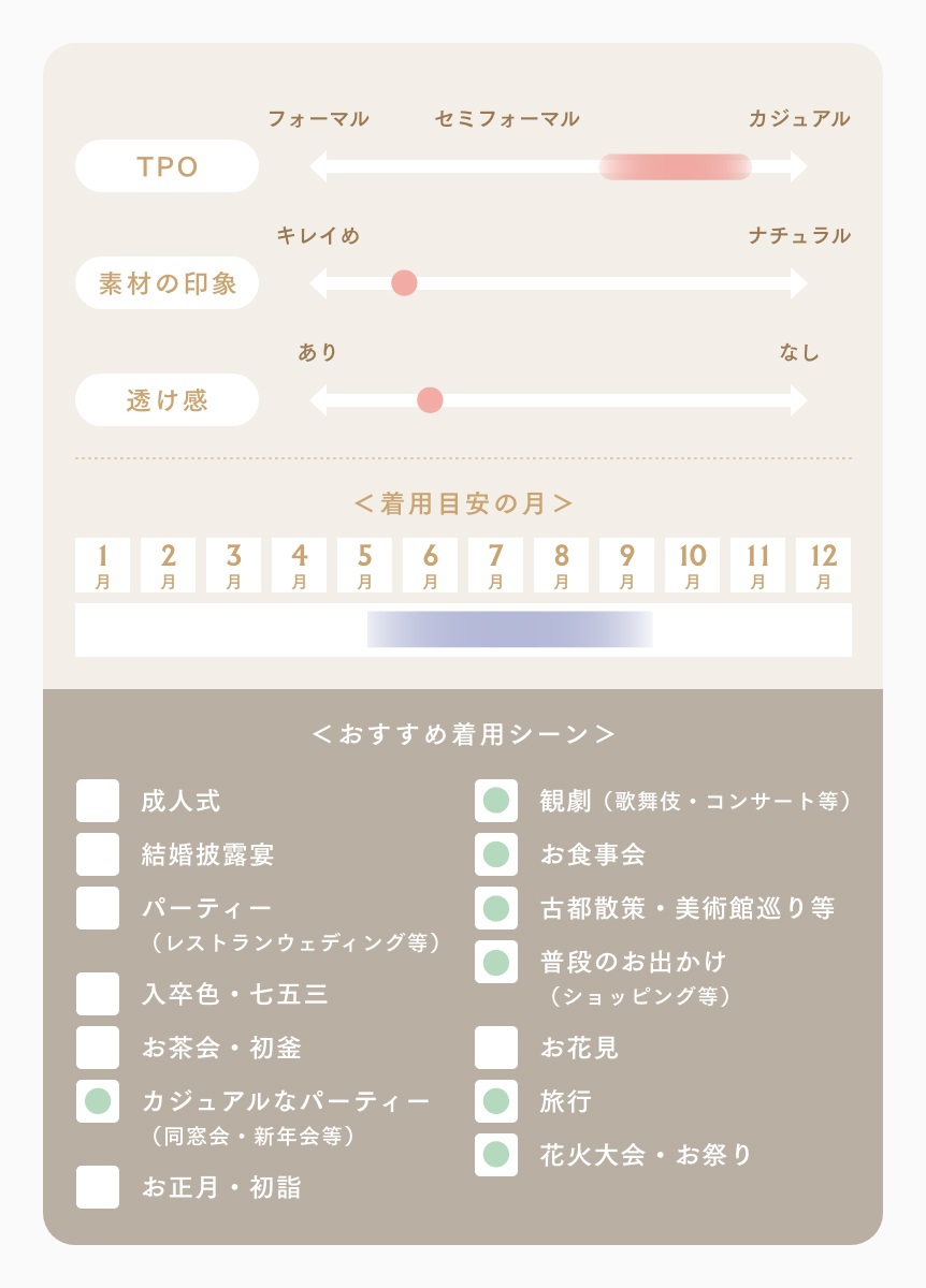 裏地の無い単衣仕立て付きですので、単衣や盛夏の時期にお召しください。