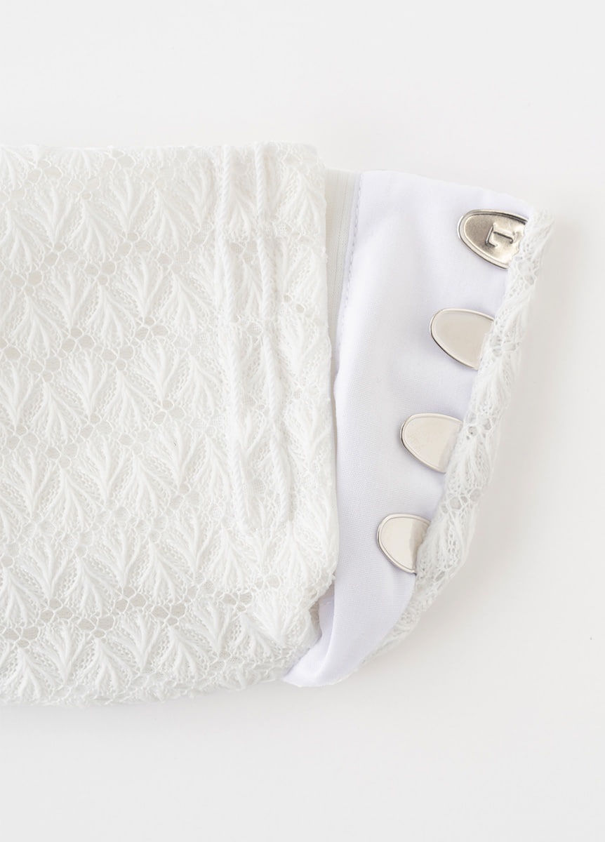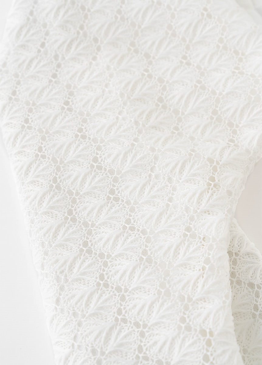 貝殻のような模様が連なり、足元を彩る繊細なレースを使用しました。ふっくらとした刺繍のようなレースが足元に華やかな印象を与えます。