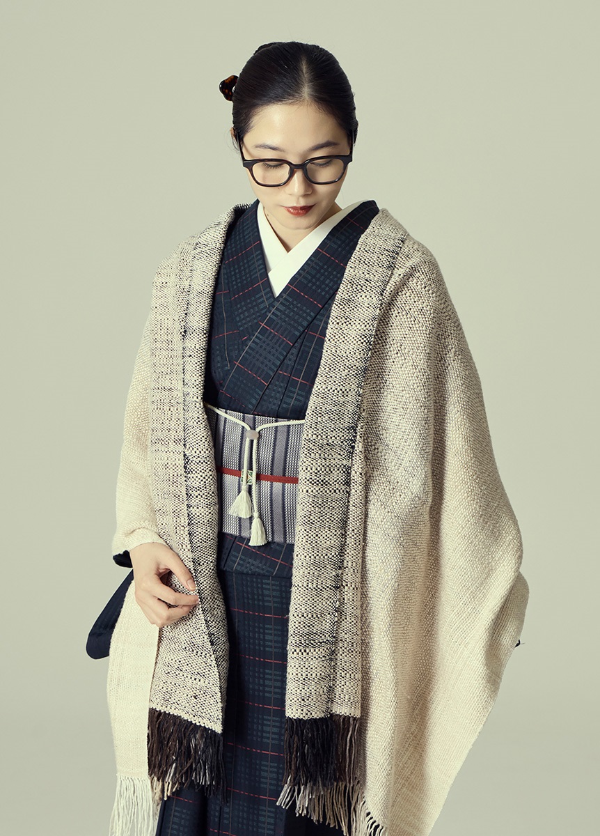 大判のストールは、いろいろな使い方・巻き方ができ、和洋兼用で使えるアイテムです。