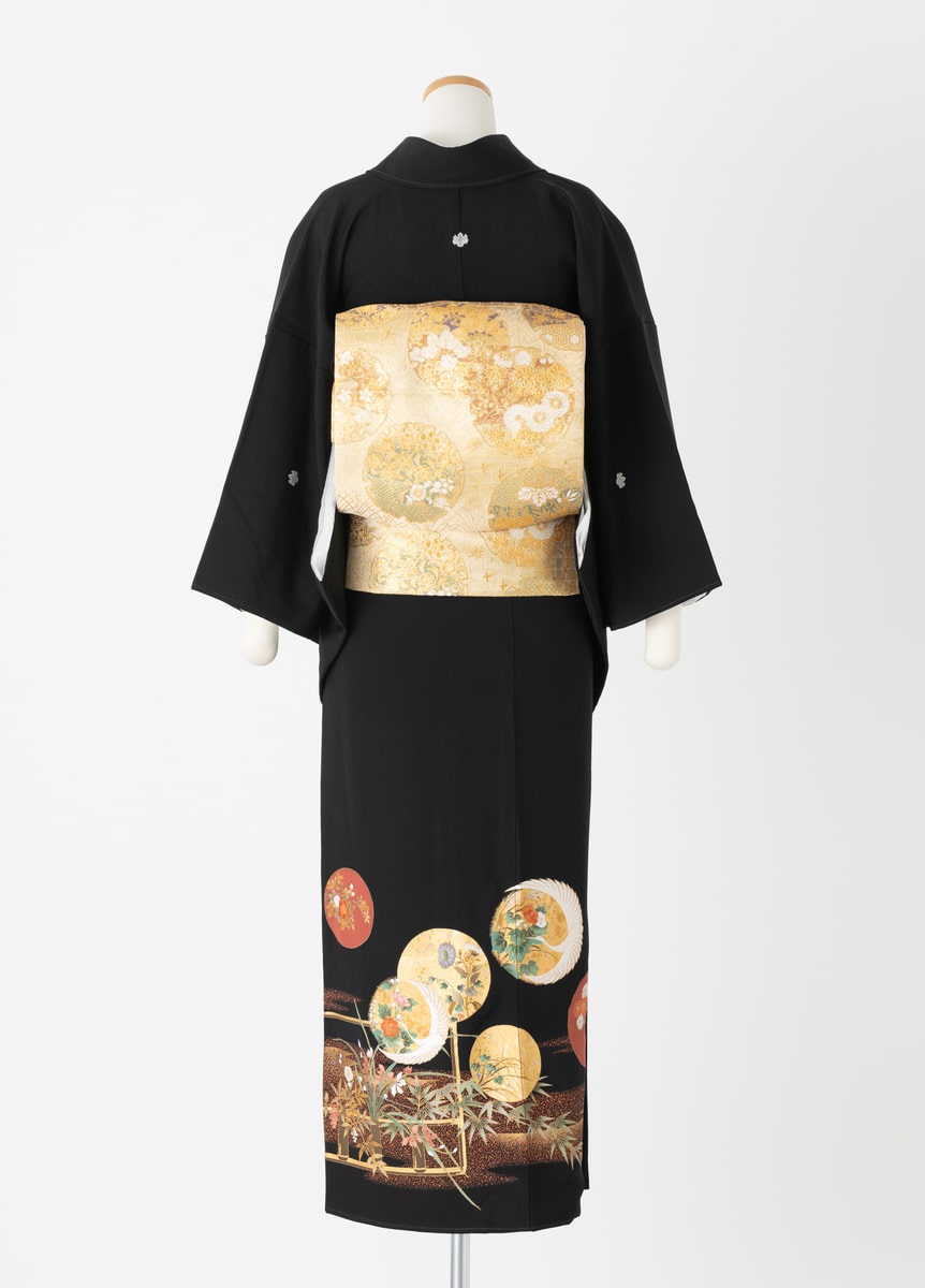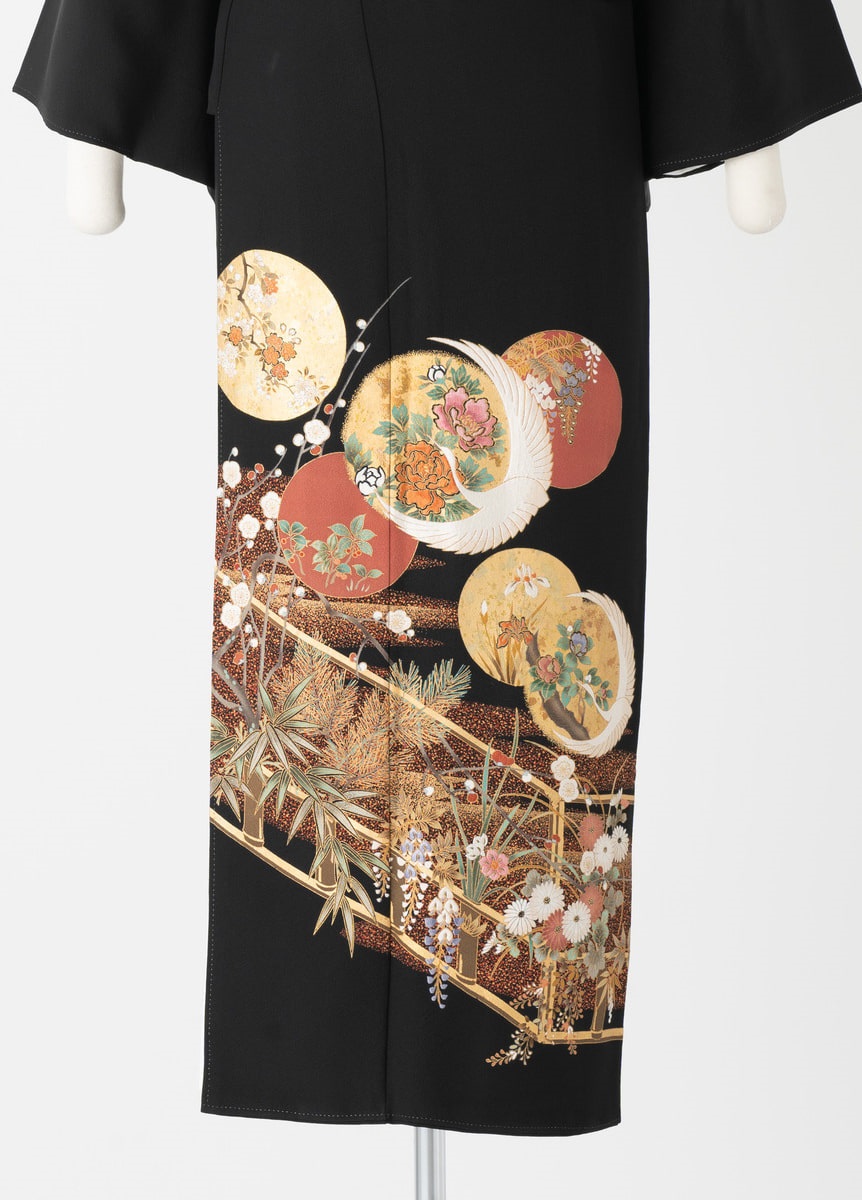縁起の良い鶴と四季折々の花をデザインした豪華な黒留袖です。花々が描かれた丸紋は美しい月夜を連想させます。華やかな黒留袖をお探しの方におすすめです。