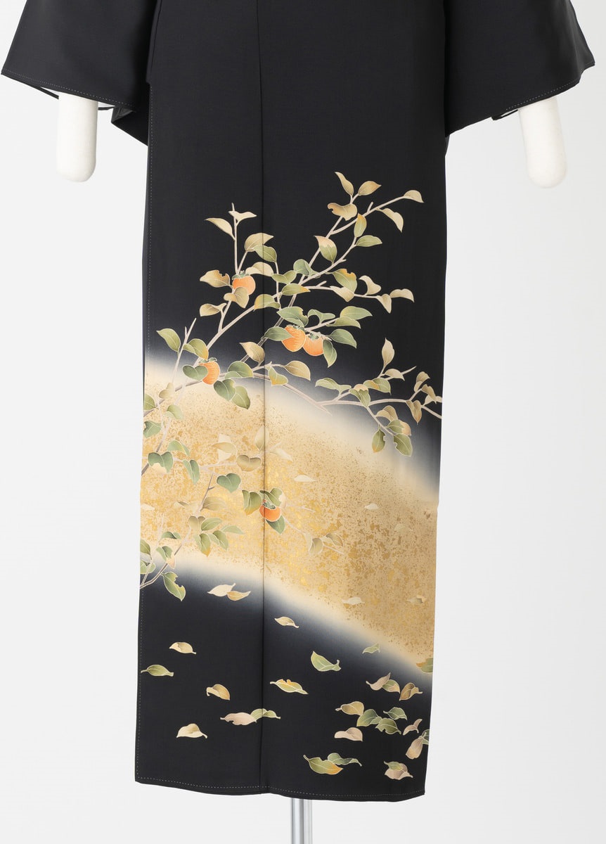 秋の柄として相応しい柿を描いた黒留袖です。柿柄は縁起のよい吉祥文様として、子孫繁栄や豊かさを表しています。