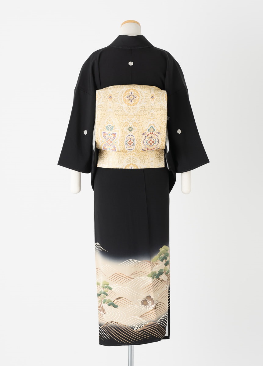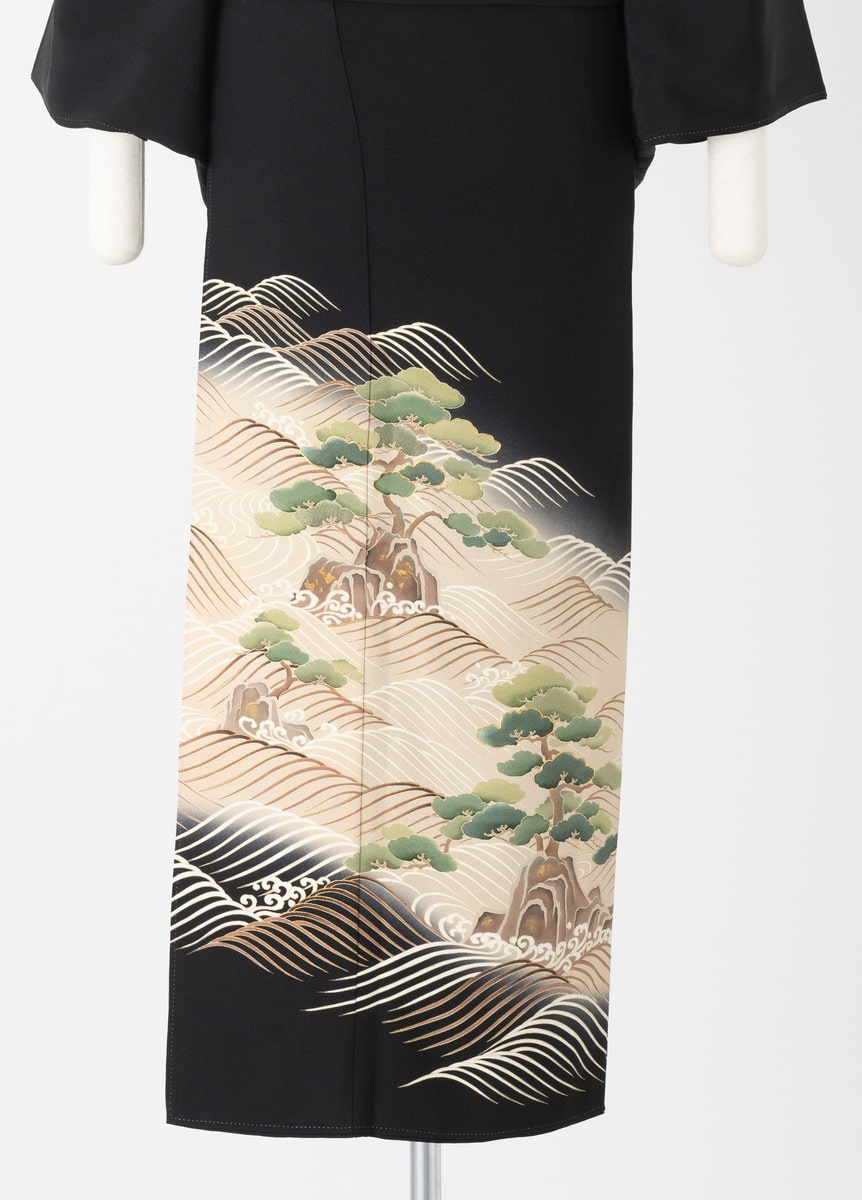 波と松が描かれた落ち着いた雰囲気の黒留袖です。松は吉祥文様として、不老長寿や永遠の意味が込められています。控えめな黒留袖をお探しの方におすすめです。