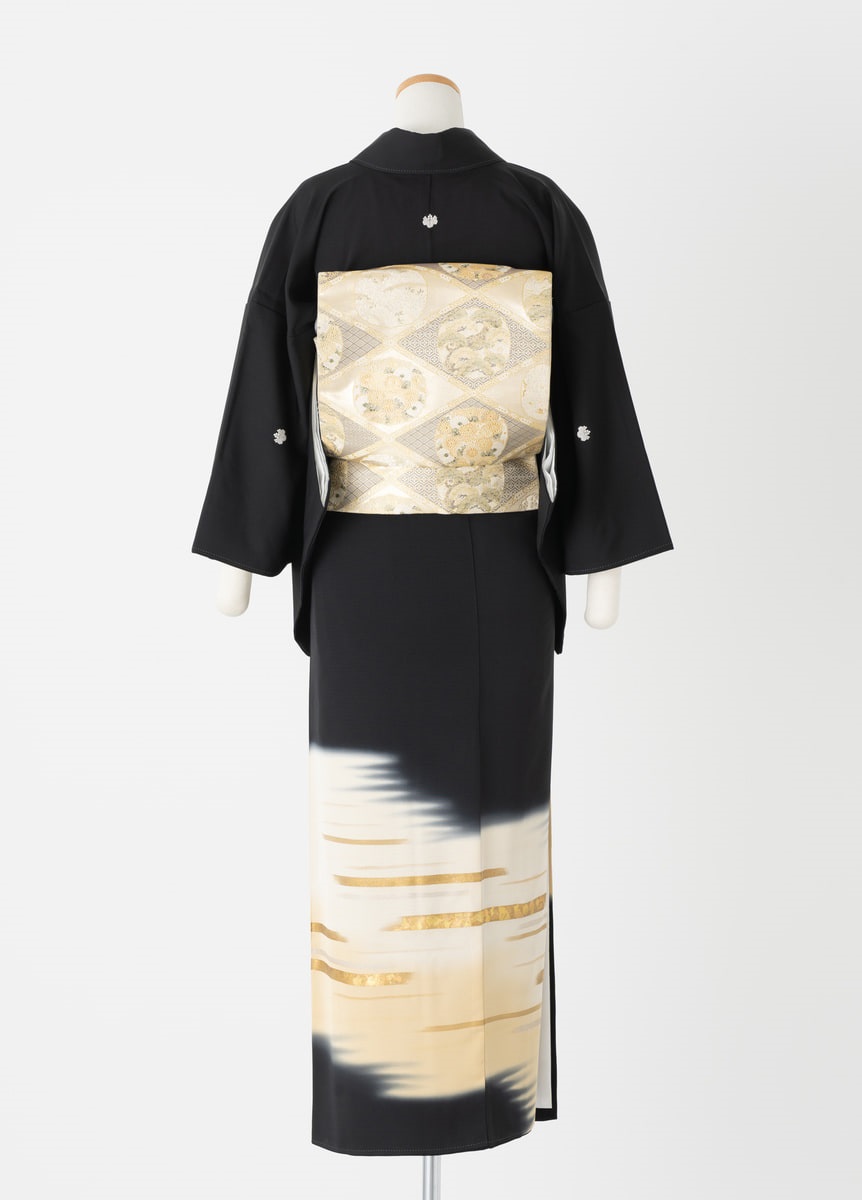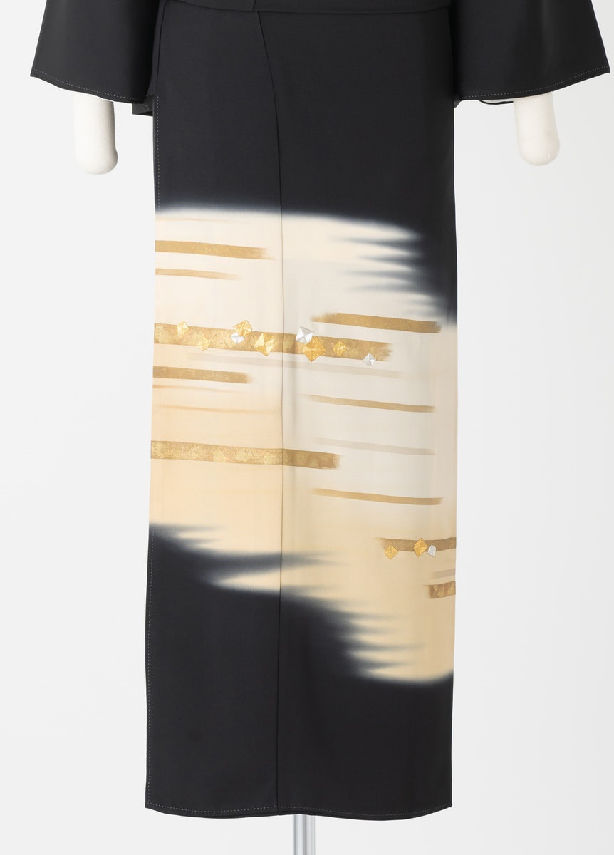 ぼかしと幾何学的な模様のシンプルな黒留袖です。ポイントに金駒刺繍を施しています。控えめな黒留袖をお探しの方におすすめです。