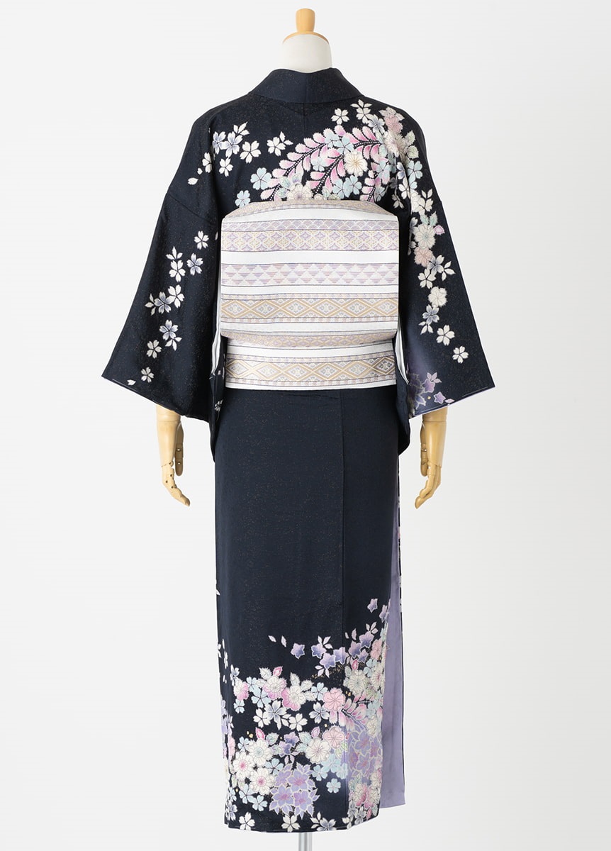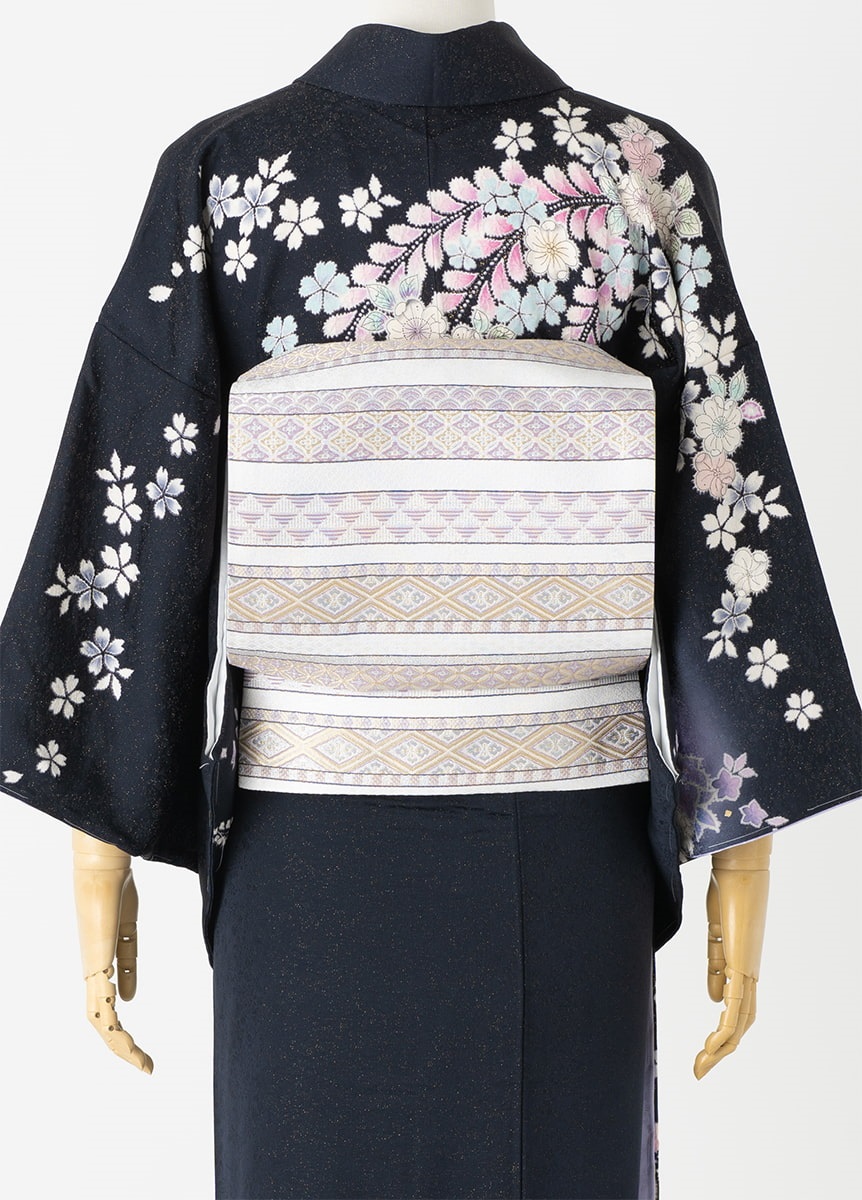 すっきりした色合いの横段模様の袋帯です。横段のデザインは、前太鼓は縦柄になり着姿をすっきりと、後ろ姿は豪華な文様が並び華やかに魅せてくれます。