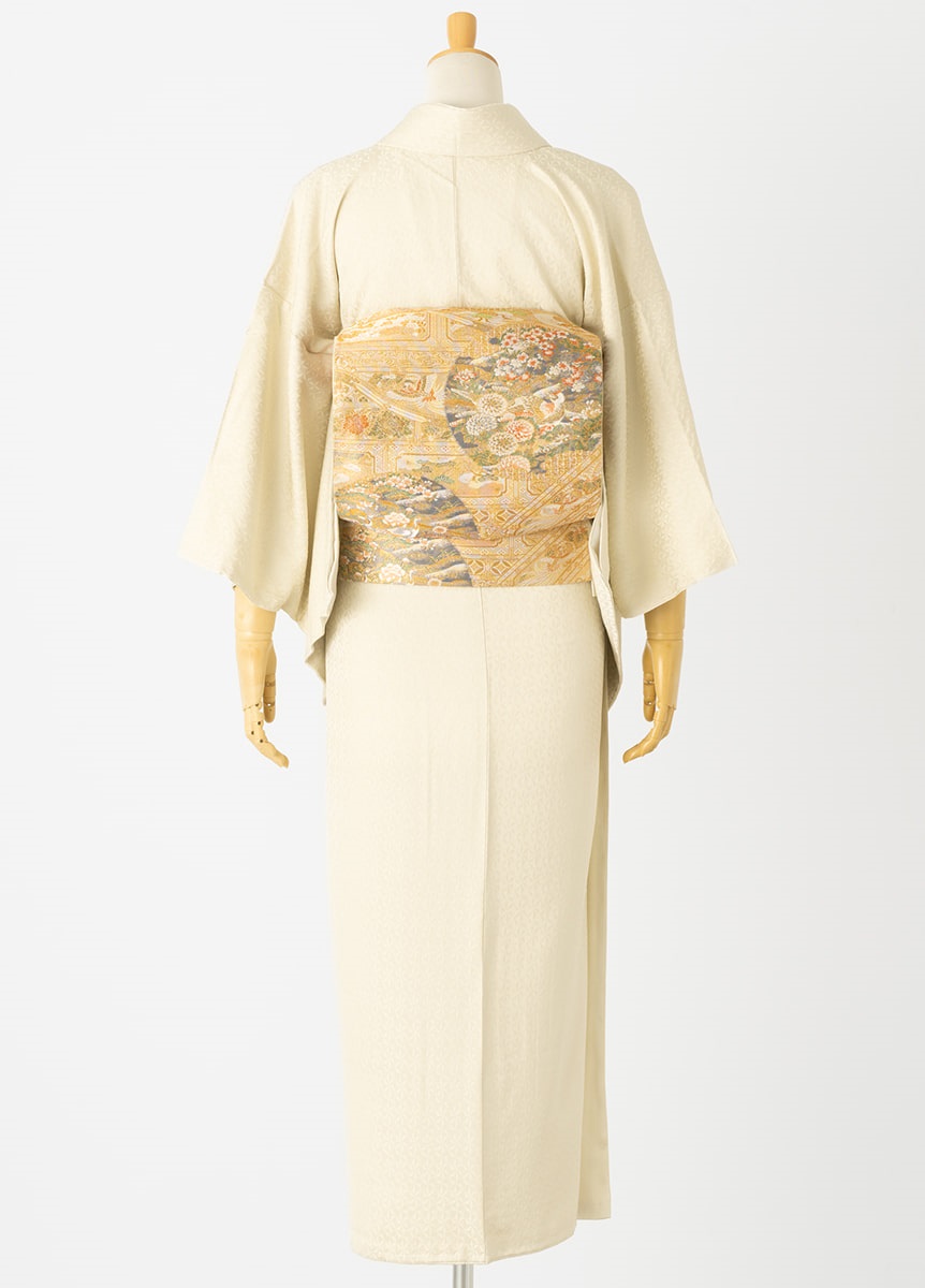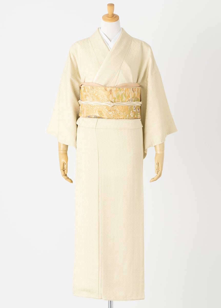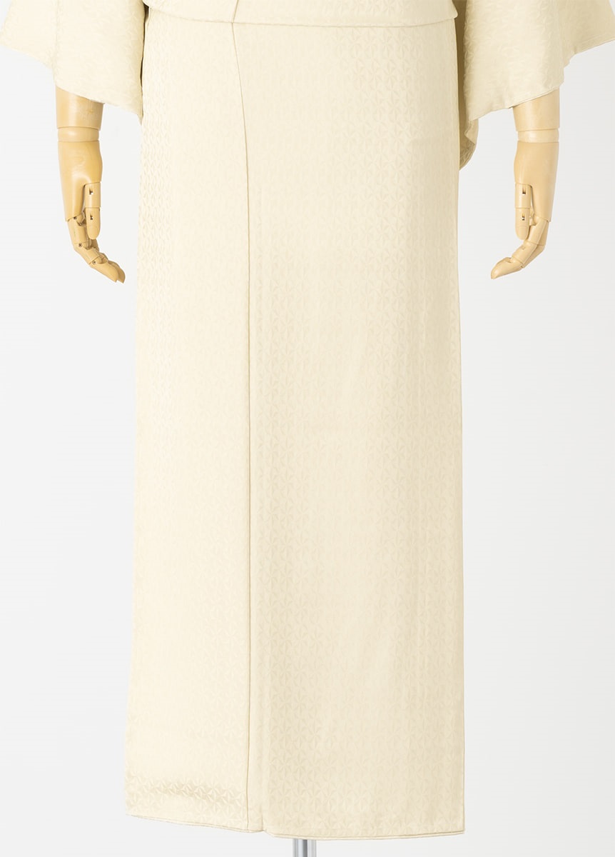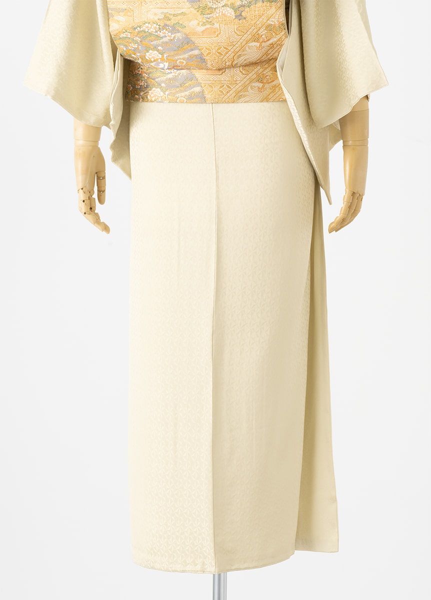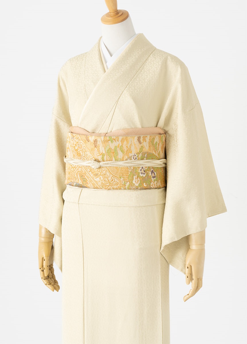 古典模様「麻の葉」を切子細工へと連想させるような幾何学文様にデザインしました。絶妙な大きさの文様は、上品な印象を与えます。光沢の出る部分、出ない部分の組織を工夫した美しい地の為、色も深みを持たせるよう何色も重ねて、肌なじみの良いクリーム色を表現しました。