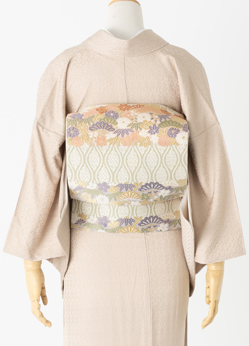 花柄と立涌を横段にデザインした袋帯です。前太鼓は縦柄になり着姿をすっきりと、後ろ姿は豪華な文様が並び華やかに魅せてくれます。