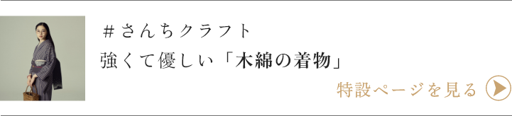 木綿着物は、吸水性や通気性がよく、肌にまとわりつかずに「サラリ」とした着心地で、カジュアル着物の定番として多くの人に親しまれています。木綿の持つ「手仕事のぬくもり」を感じさせてくれる素材感は、ナチュラルな印象を与えてくれます。