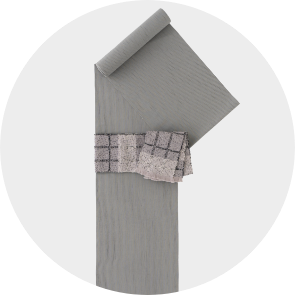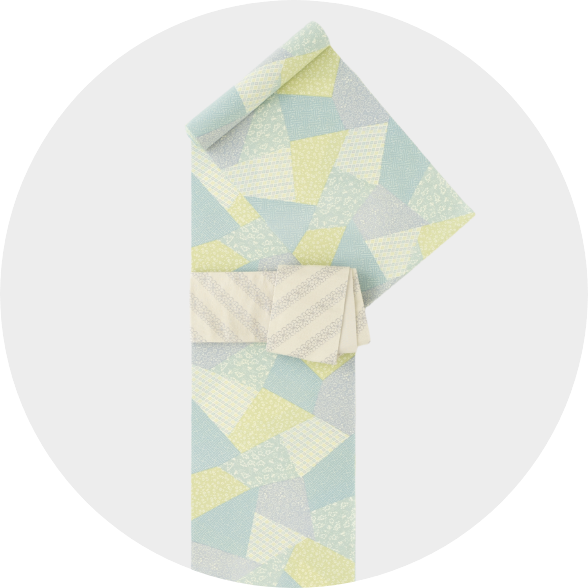 『きものやまとベーシックきもの』のコーディネート帯として創作したオリジナルデザインの半巾帯。織物の中でも合繊素材の一大産地である群馬県・桐生市で製作しました。季節はゆかたから袷(あわせ)の着物まで通年お使いいただけます。