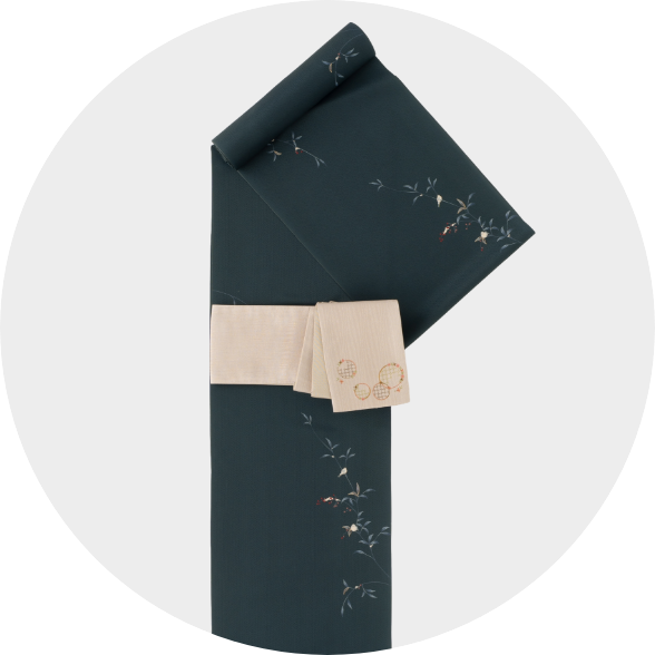 セットに合わせた帯は、結んだときに「刺繍」が着姿のアクセントとなる、オリジナルの半幅帯・へこ帯。前太鼓の部分はシンプルで、帯締めや帯留なども合わせやすく飽きのこないデザインです。