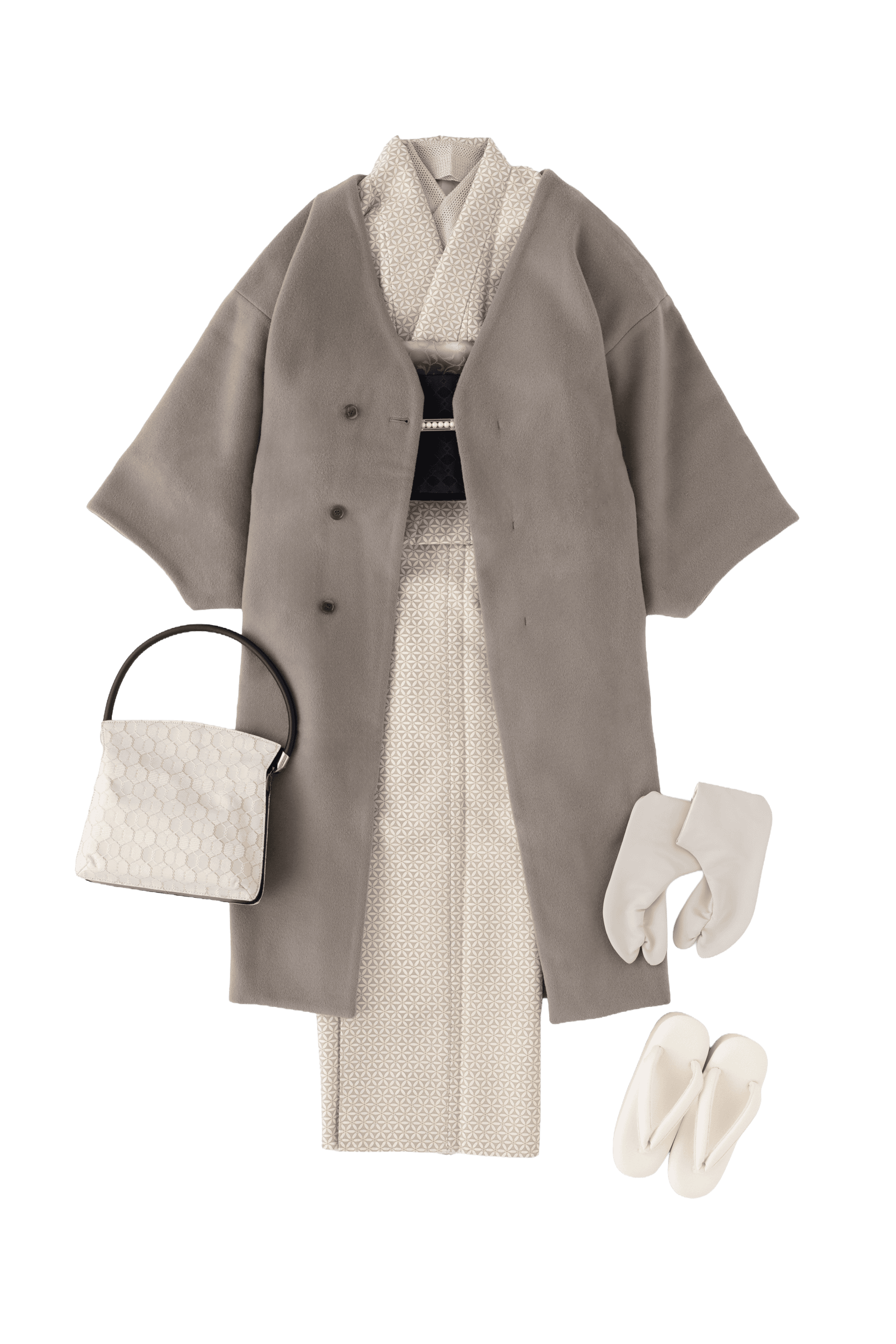ウールコートをあわせた上品な装い。洋服でも使えるコートは脱いだら着物!なんてサプライズに。淡い色のワントーンきものに濃い色の帯で引き締めた上品なコーディネートです。半幅帯はお太鼓風に結ぶとより上品な印象を与えます。洗える素材のきものは汚れが心配なお食事シーンにぴったりです。