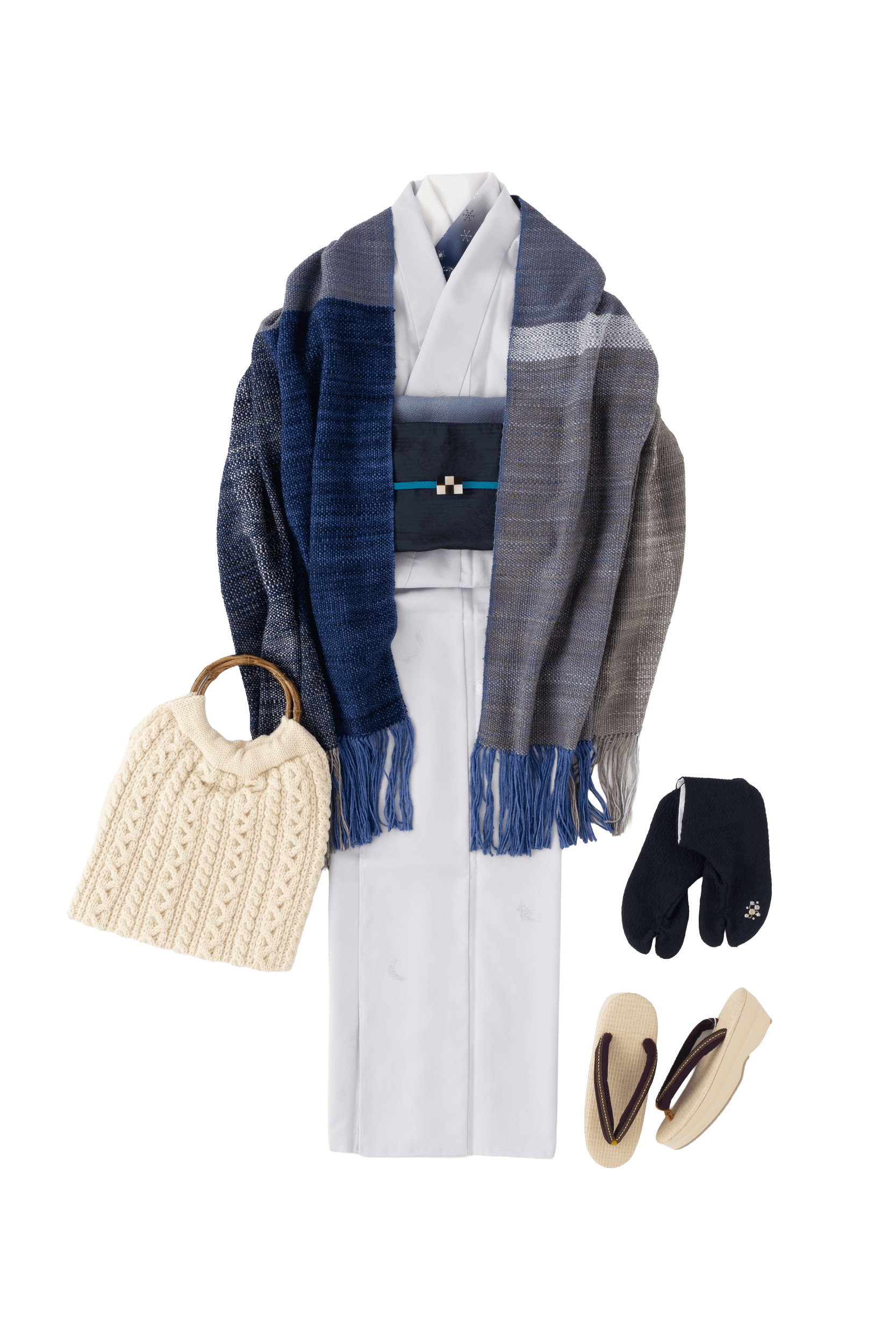 おしりまですっぽり、あたたかさをキープする大判のショール。バッグもニットで、見た目も温かな印象です。すっきり凛とした寒色系の着物なので小物を濃い色でまとめたコーディネート。へこ帯は半分に折れば半幅帯として使えるので、背中がペタンこで座りやすい吉弥結びがおすすめ。しわになりにくい素材の着物は、長い時間座っている屋形船にもピッタリです。