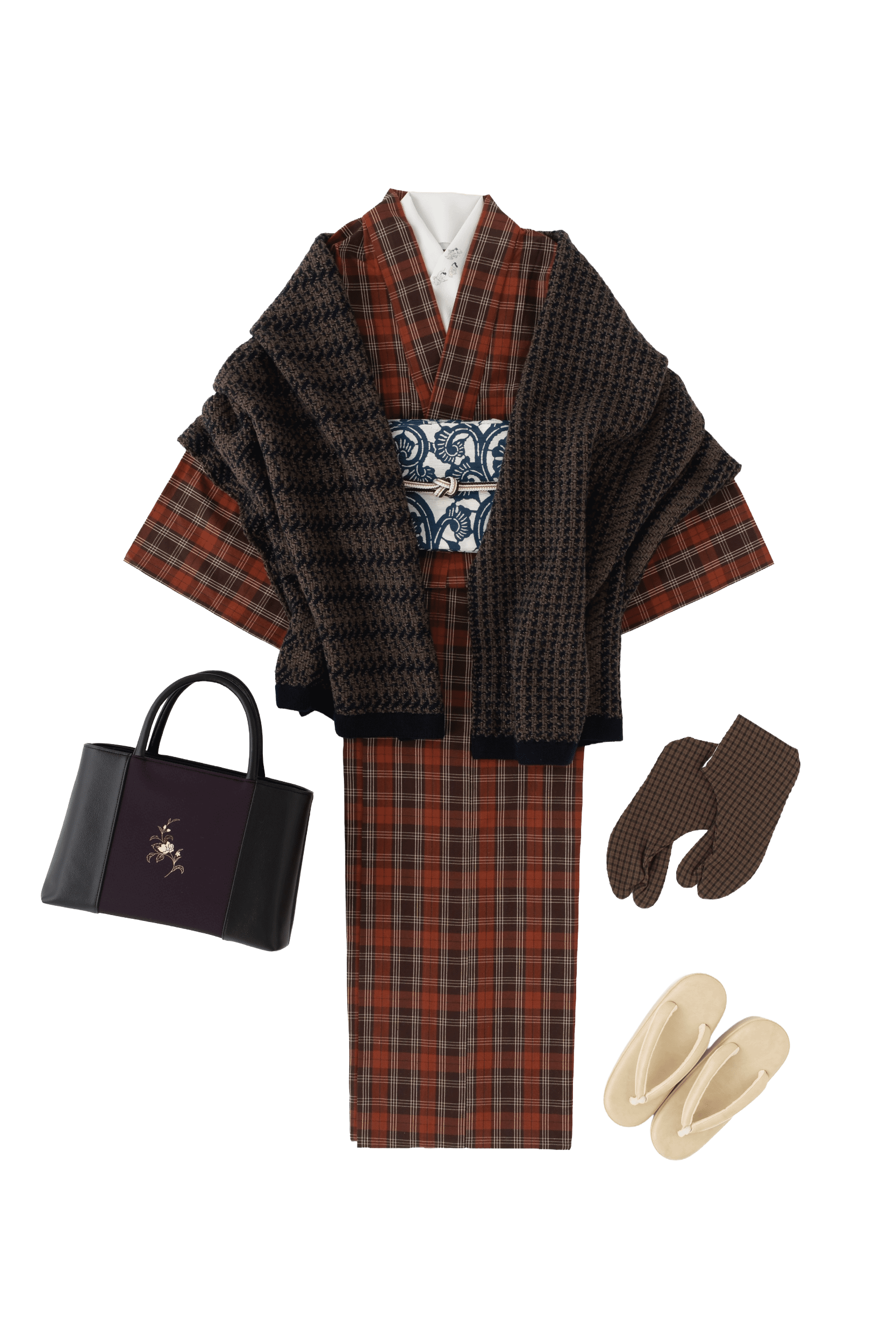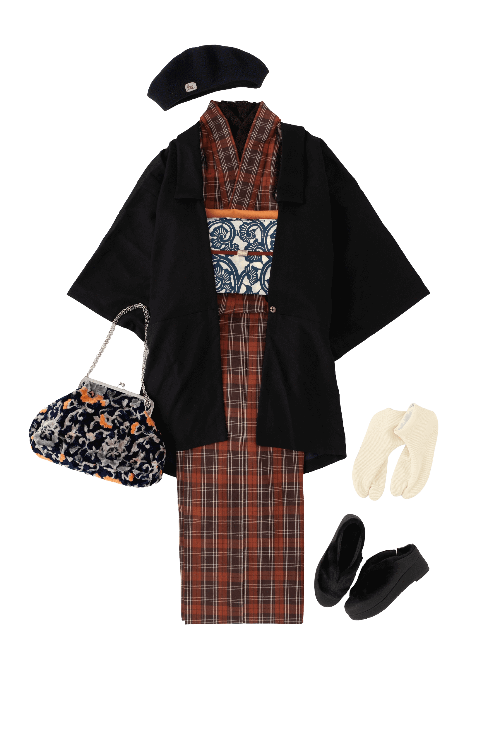 きものも羽織も細かい柄なので、無地感覚で街になじみやすいアイテムです。半衿の千鳥でかわいさをプラス。大きなバッグはあたたかい飲み物やアームウォーマーを入れても余裕です。半幅帯は文庫結びなどボリュームのある結び方にすると羽織姿が丸みを帯びてかわいい印象に。きものも羽織も洗える素材なので、屋台で食べ歩きしても安心です。