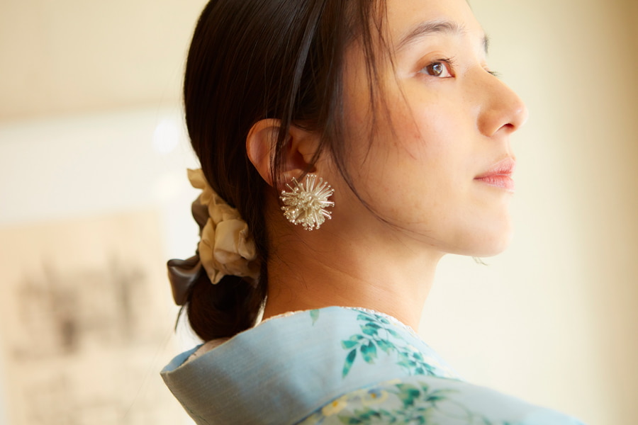 〈右〉ゆかた | 雪花絞り 夏切子 青鈍色 71,500円(ゆかた仕立付), 帯 | 博多紗献上八寸名古屋帯 五献上 玉蜀黍色×千草色 57,200円(お仕立付), 帯揚 | 絽ちりめん帯揚 11,000円, 帯留 | POTTERY帯留 銀×空 オーバル 7,150円, 三分紐 | 笹波三分紐 亜麻色 6,600円, 羽織 | オーダーレース羽織 ムラサメレース 鳥の子 39,600円, 羽織紐 | 明星 13,200円